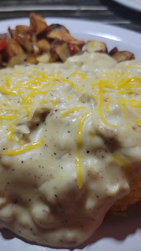 My friend got the omelet with potatoes and biscuits and gravy. The omelete had bacon and mushrooms and bell peppers along with sausage and smothered with cheese. HUGE portion!