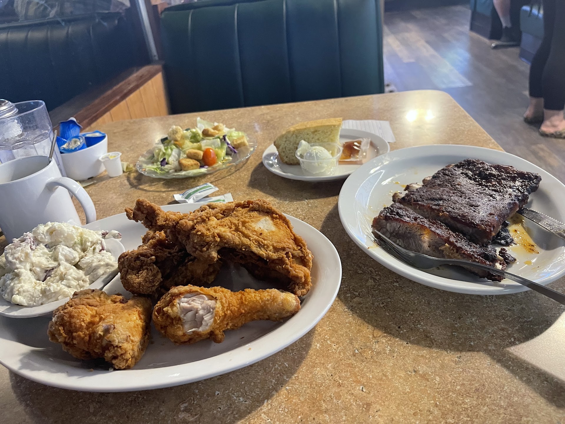 My daughter ordered the fried chicken with coleslaw. The pros: the chicken legs were good sized & seemed tender. Cornbread on the side was tasty and warm. The cons: SO salty, could not taste much of anything else & when bit into, the oil just dribbled out, flooding our mouths with salty greasy mess. The coleslaw was described to me as "tasting like leaves and inedible" by someone who adores most slaws.