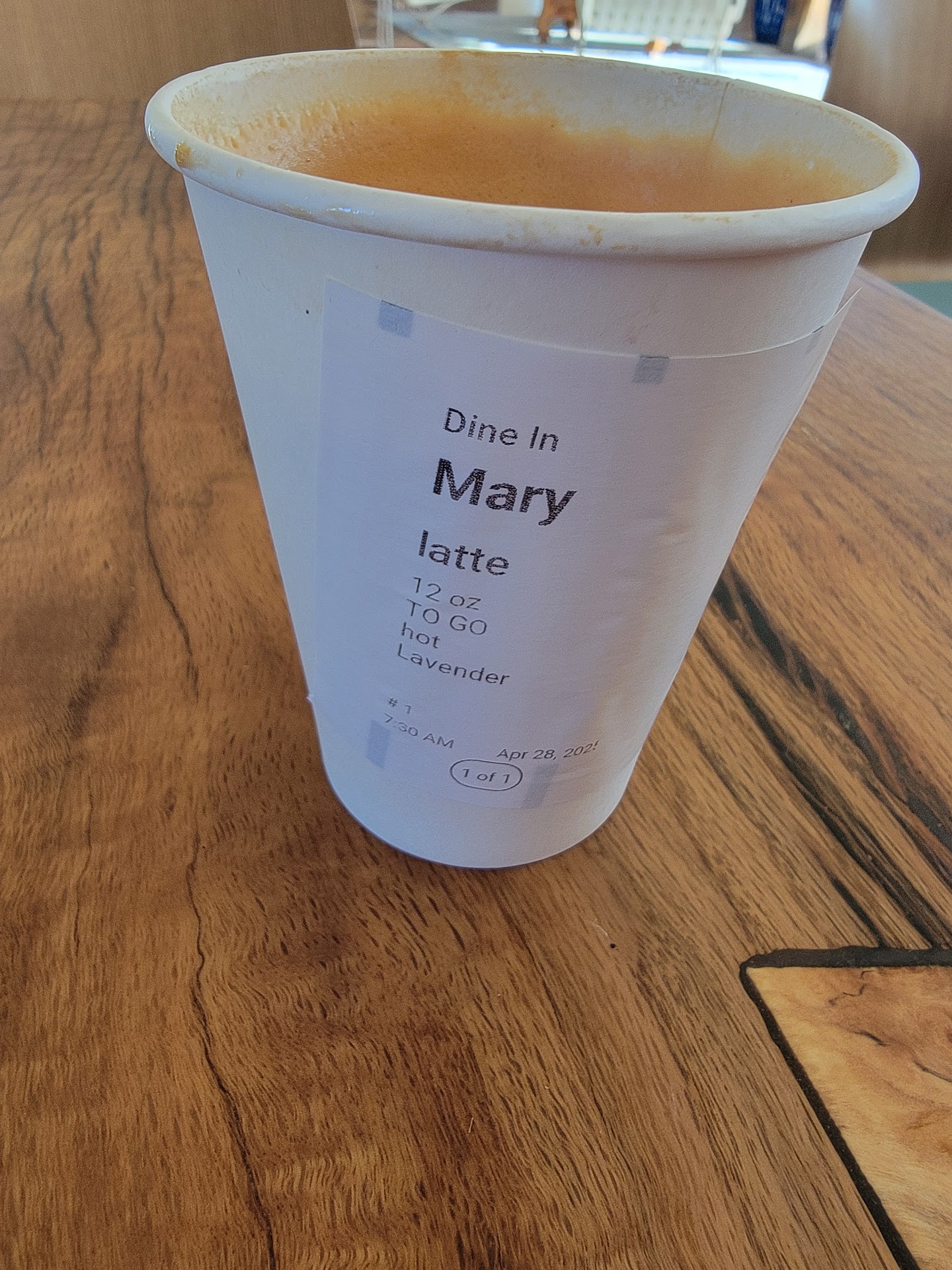 The coffee was fine. Tasty, pricy, and with odd flavor choices (spiced/Mexican cocoa but not regular chocolate?). A 16 ounce iced mocha cost me $6.85. Mine was a mobile order so I didn't interact with the staff (they gave no acknowledgement) and my drink was sitting on the counter without a lid and sloshed down the side. The serving counter is right next to a group table (that was very full) and the narrow stairs to the top seating area. There were two trash bins in this same area but no where else.