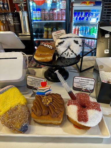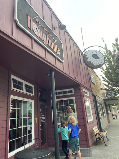 Creation and imagination combind to delight the eye and palate! Tantalizing temptations in every window with doo dads of all sizes! Giant dog bone twists more than twelve inches long stagger the mind! Huge glazed donuts initiate a salivatorial response when seeing the eight inch diameter donut of dreams! Fat squared pillow donuts filled and topped with a myriad of toppings: apple pie, whip cream, cinnamon, caramel, peanuts, chocolate! A Snow White cake donut, covered in white glaze, whipped cream and edible white pearls! Legendary Donuts goes beyond the maple bar with bacon, oh, yes, that is available as well, but more than colorful cereal pieces, Legendary Donuts gives each confectionery its own name! The "Fat Albert" for instance, a jumbo raised donut ring, drenched with dark chocolate glaze, and sprinkled with colorful mini m&m's! Another is called Sex in the City, while anotheris a Charlie Brown, and still another, Albert Einstein, chocolate covered donut with lots of coconut on top! The "Oprah", the Snow White, and the Polar Panini donut sandwich, made in three varieties and ice cream! Also available are doughsants. A square croissant dout hybrid. Square, flaky, with a hole in the center! Just try one and see how lishus it is! Also, a donut Sundae! There is much to see and drool over in their display window, and they will make custom donuts of your design, cater and make huge giant donuts like a hamburger! Visit a Legendary Donuts and see firsthand the scrumptious variety that will leave you giggly with bewonderment...