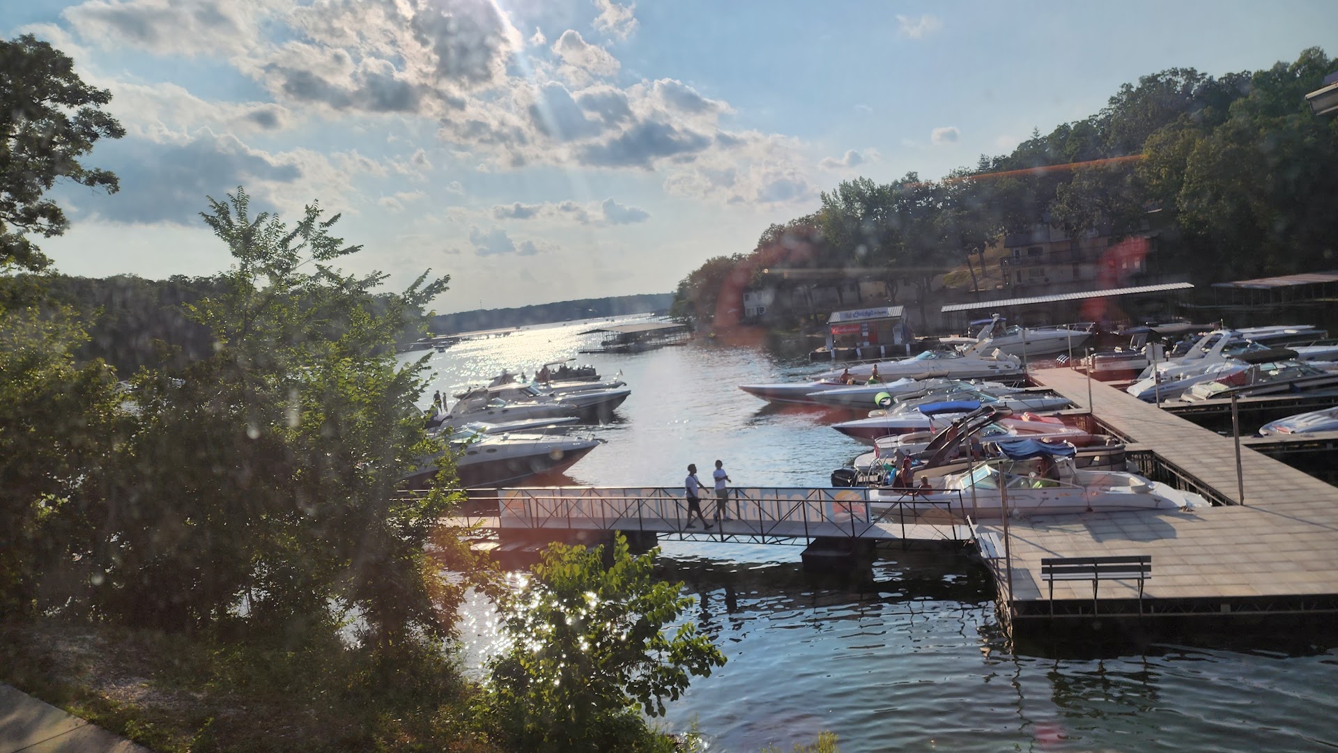 This place is huge! Boat parking and car parking. Gas station for your watercraft as well (check hours closed on Mondays). They have a main area with tons of outdoor seating and a pool. They also have some indoor seating. Then they have next door a 5 tier pool with a large stage for live music (check the website for music schedule, age restriction hours, and days of operation). We sat at the main area outside. There are lots of flies so turn on the fans or ask for the little fly spinners. We ordered the grouper finger appetizer which was crusted with corn flakes and super good, and it came with a raspberry tarter sauce which was great. We also got the jalapeno popper appetizer (you order per popper), and it is gigantic and absolutely stuffed with cream cheese and crab, great breading as well, it also came with a raspberry sauce which paired great, and ranch. These will fill you up so we also shared a seafood pasta. It comes with a deep fried dinner roll (so good), and a side salad. The pasta was super creamy and had good flavor. We also shared the grouper sandwich (which you can get fried, blackened or grilled), we got ours blackened and we chose fried green beans as our side from the recommendation of our server. The sandwich was great and came with regular tarter sauce, the fish was cooked perfect and had great flavor. The only thing was maybe it was a thinner or smaller piece of fish so the bread to fish ratio wasn't quite there, but the taste was good. The green beans came with ranch to dip and the batter was similar to like a fried pickle batter. They have a daily special and for Monday it is a dollar off Pain in the ass drinks (normally $9, so $8 on special). They are served blended/frozen in a small cup. It was delicious and refreshing, but just be aware of the small drink size for that. Overall we enjoyed our time here and definitely want to come back for swimming or live music for some more atmosphere...