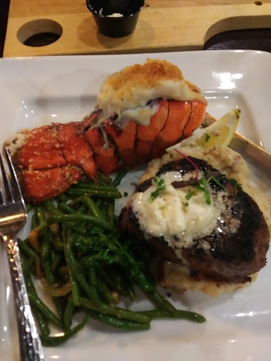 I was visiting friends in Camdenton, and they treated me to dinner at The Tavern at Trails End. What a delightful time! It was a Saturday evening, and our reservation was at 5:45 pm; the restaurant was comfortably full, even that early. The view of the lake is lovely through the windows that line one wall of the dining area, and the seating sections are terraced so that everyone has an excellent view. Our server was Jamie, and she was FABULOUS! From the moment she greeted us (āHello, Friends!ā) through the end of the meal, she was welcoming and thoughtful and efficient. She guided us in the menu choices (including the specials of the day) and cheerfully wrote down our special requests for our meals. She stopped by our table several times to ensure we had everything we needed, and was genuinely committed to making sure we had a great meal. One friend had the Veal Milanese and the other had the Salmon dinner; my friend who ordered the salmon asked me to write that it was perfectly cooked, very thick and juicy, and absolutely delicious. I had the Surf and Turf (one of the daily specials) and shared a bit of the steak with my friends; we all agreed that it was the BEST cut of beef weāve tasted in a long timeāagain, perfectly cooked, tender, and beyond delicious! The lobster tail was also delectable, and I really enjoyed the Parmesan cheese crusting. One thing I would ask of the front-of-house staff: Since this is a Midwestern restaurant, there may not be many patrons skilled in managing shellfish. The lobster tail had been partially cracked open, but not fully, and the flesh was still adherent to the shell. My knife and fork were not useful in dissecting the meat. I recommend that staff provide crackers and fish forks when serving seafood in the shell, to make it easier to get to the meat. I gave up using utensils and, after checking that it wouldnāt offend my friends, attacked the lobster tail with my fingers. It was successful but extremely messy. (Thankfully, Jamie provided some finger wipes afterwards!) The mashed potatoes and haricots verts served with the steak and lobster were wonderfully seasoned and delightful. I enjoyed my house salad (Country Salad) very much and the addition of dried cranberries and shaved Parmesan cheese worked beautifully with the honey vinaigrette dressing. One friend and I shared the Wine Flight (4 glasses), and we were able to select two vintages apiece to pair with our meals. The wine was superb, and my choices (one white and one red) matched perfectly with my food. Our only disappointment was that we were expecting the size of pour that weāve enjoyed in wine flights at other establishments. Our glasses each held more of a tasting, which left us truly thirsty for more. Overall, it was a marvelous meal in marvelous surroundings, and Jamie was the sparkle and light that topped the evening off. Thanks so much for such a wonderful dinner...