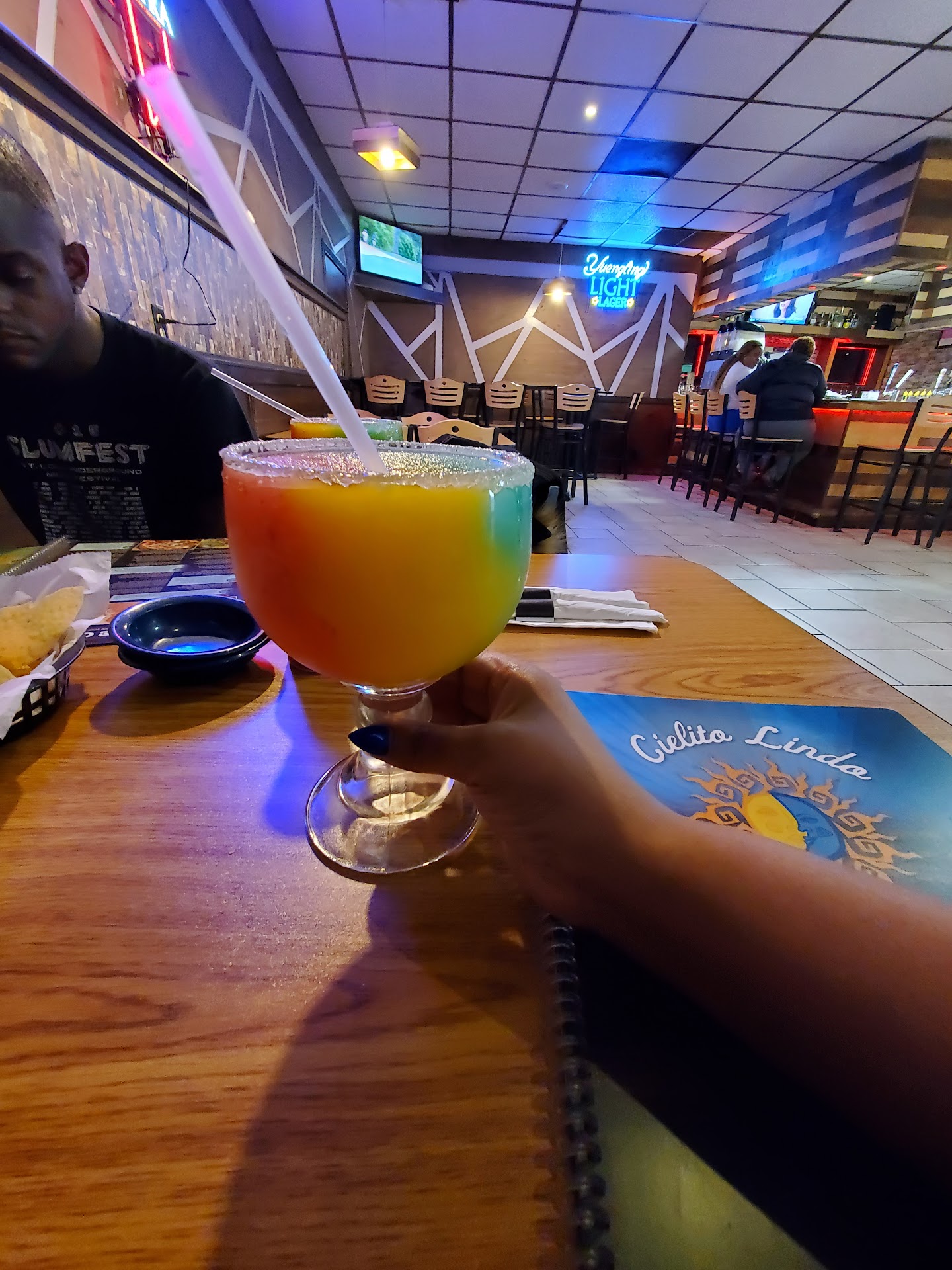 Read moreTraveling from STL and this was Super convenient since it's walking distance to from hotel. First thing I noticed was it was super clean, social distancing was definitely enforced and everyone seemed pretty happy to work there. We were greeted by all the workers in sync, it was pretty cool actually. We were seated in a specified area for those wanting to indulge in an alcoholic beverage, which again was awesome! We were given a menu and offered chips and salsa with an option to add cheese sauce. We ordered their Rainbow Margarita for starters, which by the way was strong af and delicious 😋. Hubby ordered the Steak Mexican but added grilled shrimp and cheese sauce on top-i ordered the shrimp chimichanga....soo the food comes and it looks delicious! My hubby is straight bashin', but he hates when he orders steak and they don't ask how he likes it cooked! The first bite of chimichanga was tasty, second was 😋 But the third I decided to dip in the sour cream garnished on my plate w/guacamole, beans and lettuce. Let me tell you guys, this s$#% had to be spoiled!!! I nearly threw up in my mouth, seriously-i spit it all out and smashed the rest of my margarita as well as the shrimp inside my burrito. Check the expiration dates bruh, you guys really messed me up with this...