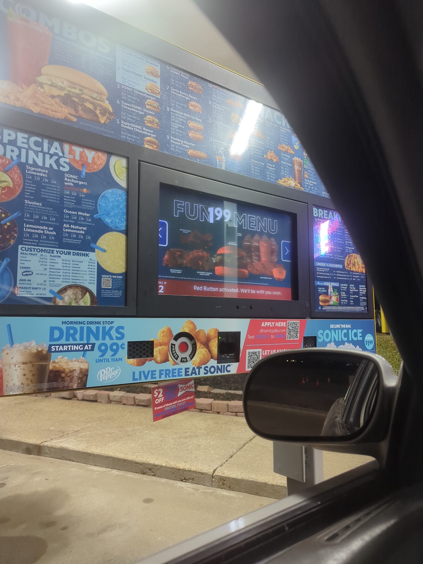Read morePulled up and the 1st few kiosks didn't work. Moved and had to drive half way around to find one that did work. Ordered online so that didn't matter that much, but.., checked in, watched the progress on the screen indicate the car hop was on her way and continued to wait, and wait, until I started to think maybe they had a mix up. Pushed the button and the girl said they were still waiting on a food item from the kitchen. 1st why did it say they were on their way if it was still in the kitchen? The car hop wasn't very friendly. She wasn't totally rude just indifferent. This wasn't the worst Sonic experience, but just reinforced my reservations about this...