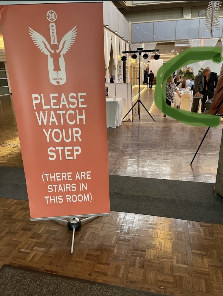 Edited to add after response from the owner: I have added some photos to this post to help everyone. None taken by me, all were already posted on google. I added red arrows indicating where elderly people continuously fell. The lights and signs only help so much. Again, beautiful venue, but not recommended if you have relatives over 70. If you look at the photo of the large sign telling you to watch your step, you can see that I circled a group of people. That is the spot the first person tripped/fell, and it looks like this photo is from when the person was on the ground. Regarding the door, I circled a picture where you can see the interior door that was locked. The interior door goes to a hallway connecting to the restaurant and to the main exterior doors. They are beautiful glass doors. There are other exits that could be used to get outside, but we did witness someone from the wedding come towards us and push/pull on this door to try and open it. It is the visually obvious path to the front exit. There are other possible exits nearby if people are looking. That is...