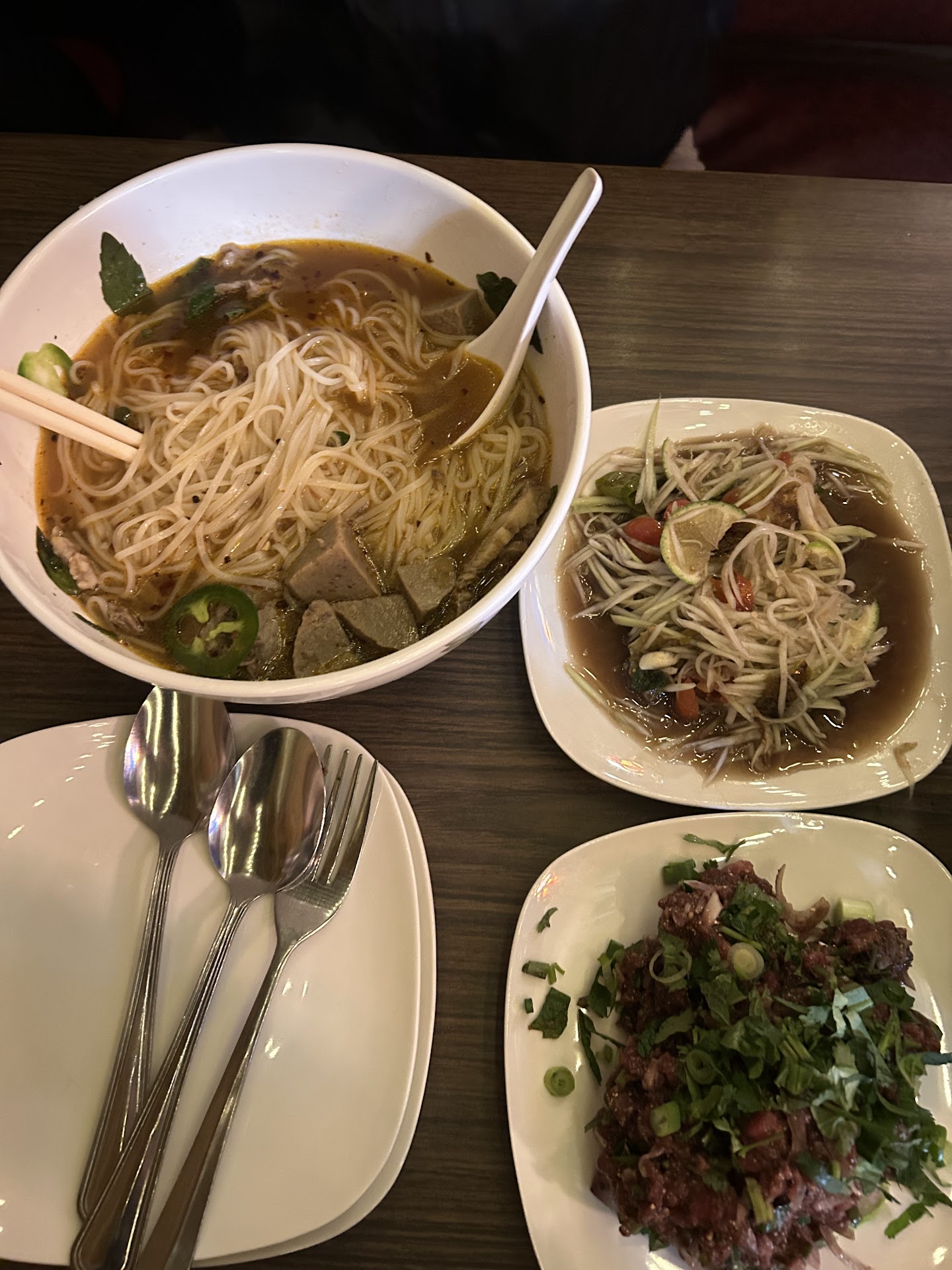 Read moreMy husband and I stopped in on a whim and got take out. We found parking on the street so no issues there. The very spicy request for all of our dishes must’ve missed the mark, because the papaya salad, the raw beef laab, and the pad see kraw were all pretty plain. The papaya and pad see kraw was a bit on the sweet side, and to our disappointment, not much flavoring in the raw laab at all. The Thai tea was not freshly mixed but out of a can, which I can get from the Hmong store down the road. I was expecting a more authentic fresh Thai tea mixture. On the positive side, the atmosphere was cozy and the customer service was very prompt and polite. It may have been that my “very spicy” request was misheard or the chef missed the mark, by not over doing the spice level to the extreme, but I would not have asked for very spicy if my husband and I didn’t want very spicy. Overall, if you want a quick Asian meal on a budget, give this...