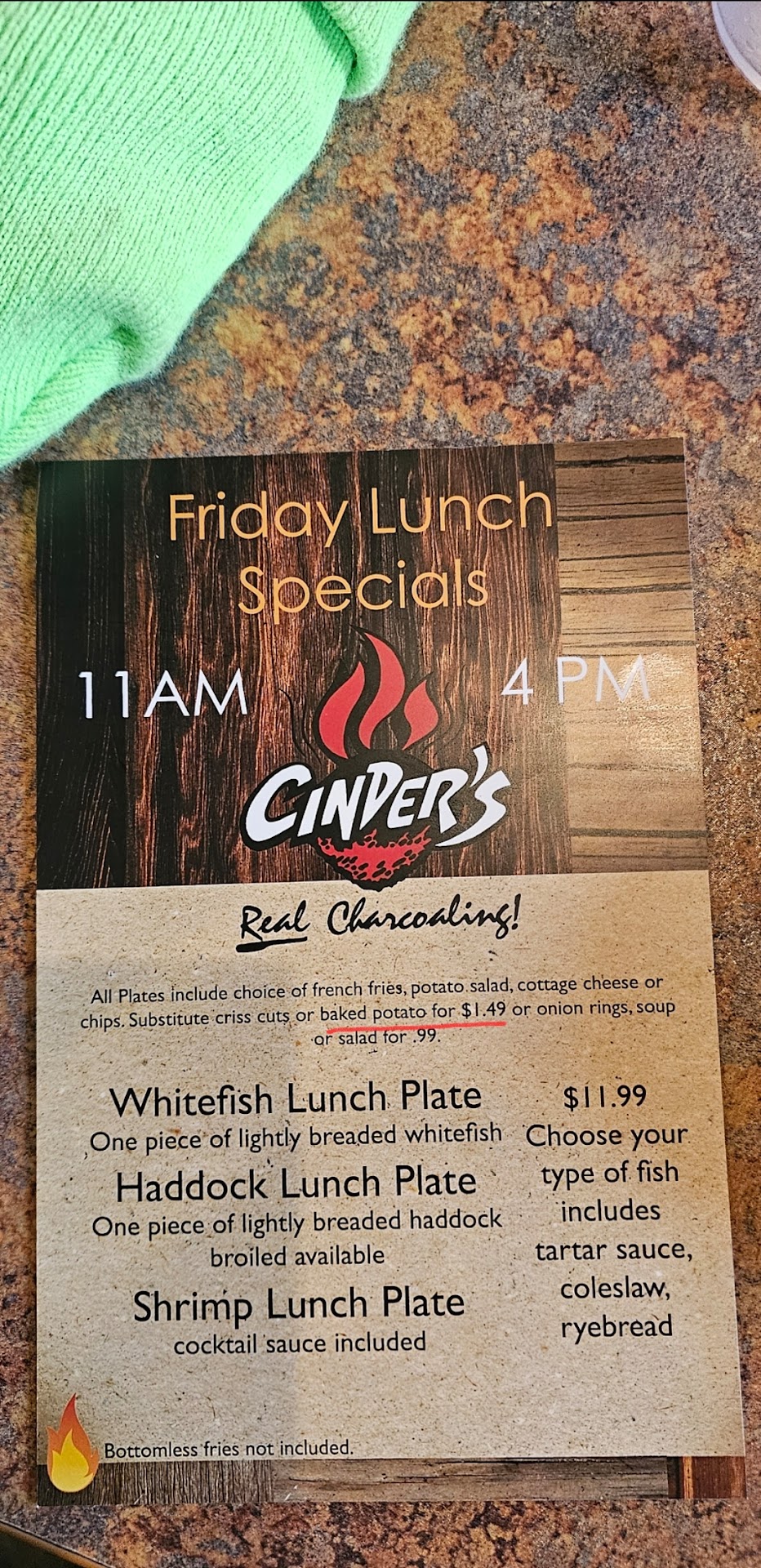 Read moreTonight was a real disappointment. We went to Cinder's for dinner. It was busy, but we have been there before when it was like this and we didn't have to wait to terribly long to get our food. Tonight, we ordered our food (2 cheeseburgers, a hamburger, chicken tenders and fries.) As we sat there we watched many orders being made and going out the door. Honestly, we were happy they were busy. We totally support local businesses, but then we noticed that more orders were going out the door and many people have been waiting for some time that were dining in. It was over an hour and we still were waiting for our food. During that time our waitress came to our table one time mumbling something about it taking a long time for the order. After waiting even longer, we were finally able to get our first refill. When our food finally showed up another 15-20 minutes later...the food was mediocre at best. We didn't have a complicated order, but it is disappointing when you order a cheeseburger and the cheese isn't even melted. Plus, what was asked to be put on our burgers wasn't correct. The waitress never came back to check on us or to see if our food was ok. By this time, the restaurant wasn't busy. We even had to go up and ask for our check. Maybe, if we would have ordered online we would have had a better experience. I understand being short handed on staff, but we should have been told right away that we would have a long wait for our food. We definitely will not be going back and dining in there...