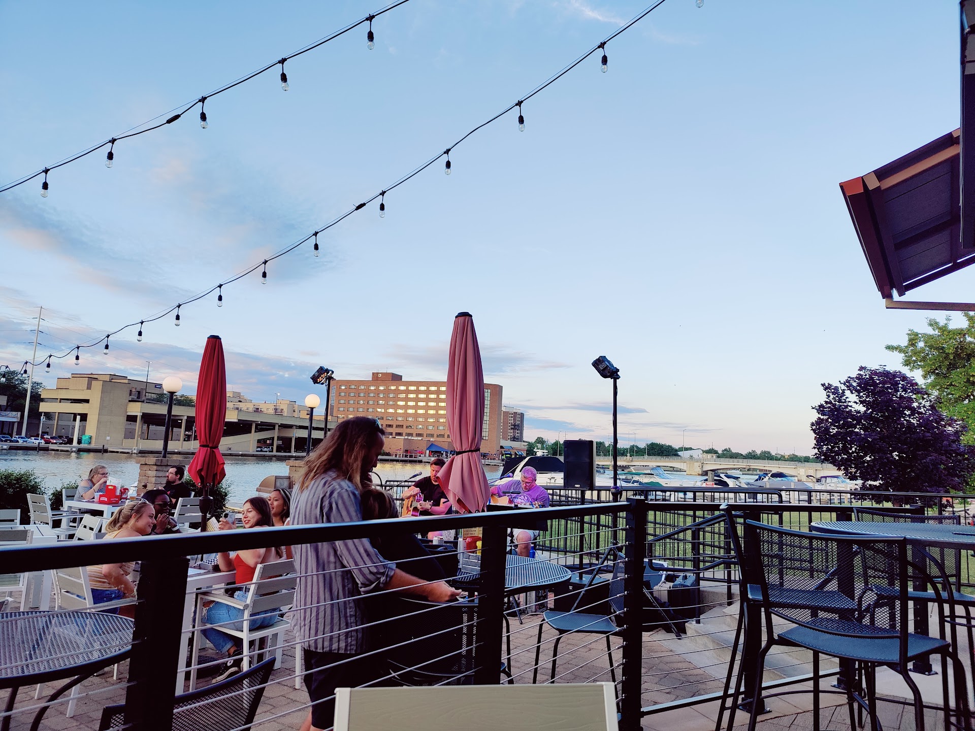 Read moreWe visited with the family (2 adults and 4 children) last night. We arrived at about 7pm. There were a handful of tables open outside and more than half open inside. We chose to sit inside but had a hard time finding anyone to help us and couldn't really seat ourselves because all of the open tables were dirty or had a bottle of cleaner and a rag on them. After being seated and our drink and app order taken, it was about 20 min before we received our drinks and another 10 min after that before our appetizers came. We ordered the cheese curds and Bam Bam shrimp. The cheese curds were over cooked, half of the order was empty shells of breading stuck together with melted cheese. The Bam Bam shrimp, despite tasting good, was not breaded, it was cooked shrimp with the sauce on the outside. Our server finally took our order after 35 min of being there. There were a bunch of waitstaff all over the place but it seemed like our server was never anywhere to be found since the only tables I had seen him go to were ours and one other table. About 4 parties had came in after we had our orders taken, were seated and received their food long before we had. My son ordered the Bruchetta chicken pasta which was said to have a cream sauce but instead was about 3/4 of an inch of oil in the bottom of his bowl. 2 of us ordered the fish and chips. The fish was great but the chips were a bit over done. Our youngest ordered off the children's menu, no complaints there and the frisbees were a neat idea to serve their food. My husband ordered the Bam Bam cheese curd burger which looked delicious. After spending an hour and 45 min (a majority of that time was waiting) and over $100 at Dockside, I was ready to go. We've been here before on our travels on the boat and have had ok experiences. This last visit tipped the scales and we will...