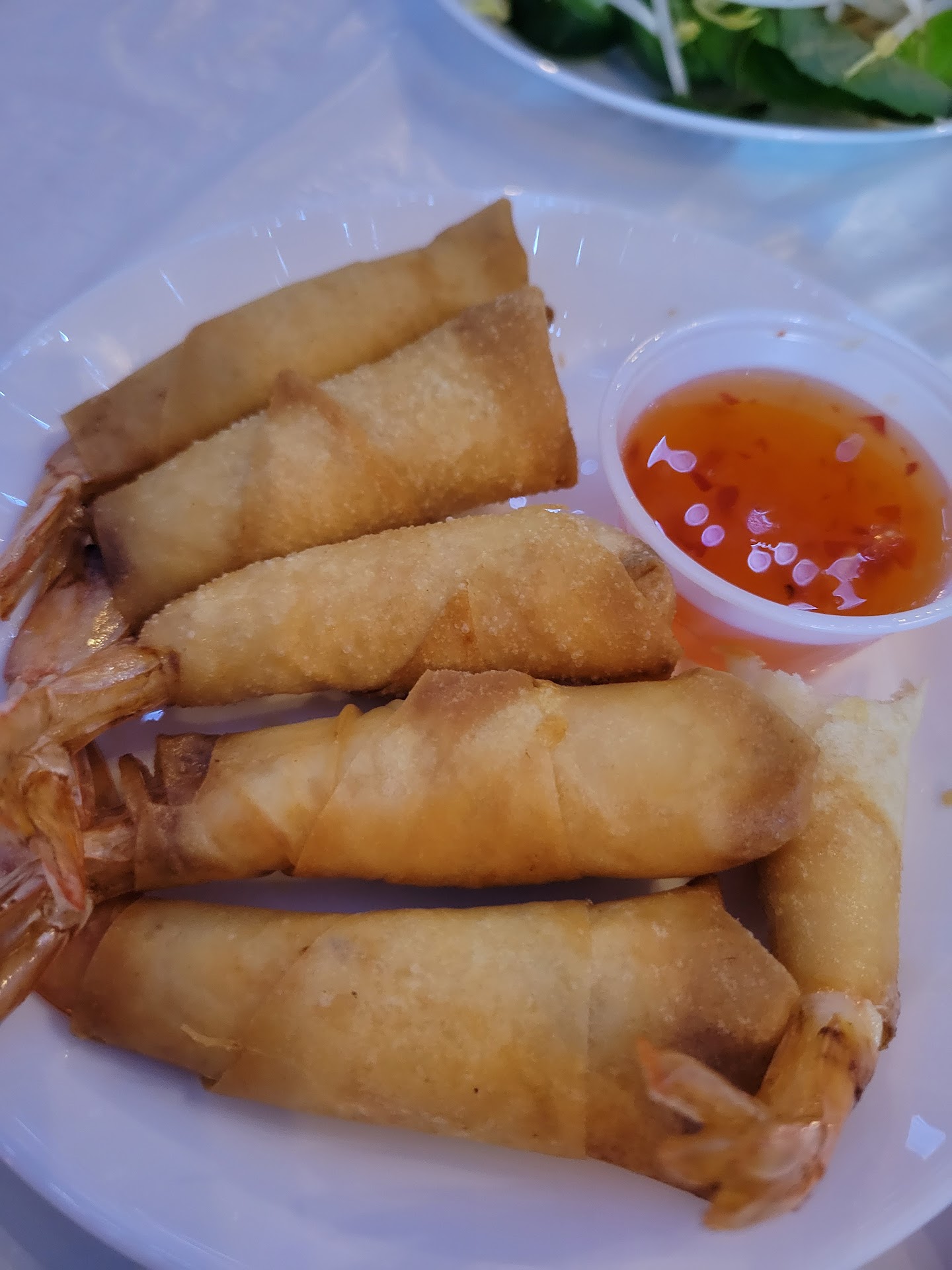 4/5. Egg rolls with mild hot dipping sauce. Crispy crust with unavoidable residual cooking oil. A Good appetizer while waiting for your food.
