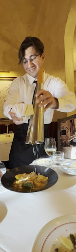 When he served our food, I got the pasta where it gets tossed in the cheese wheel. Our waiter barely talked to us. And apparently the table next to us got the same thing and he was chatting them up. It just felt like he was not interested in serving us or taking care of us during the entire meal.... Maybe because we didn't respond in Italian.
