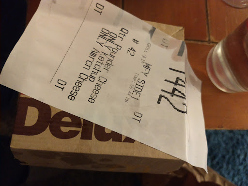 Gave her my receipt, the bag with the buns w/the lettuce and mayo extras. She opened and saw no patty, threw it into trash. Called a young white guy wearing a red shirt over to punch in his code to do refund.