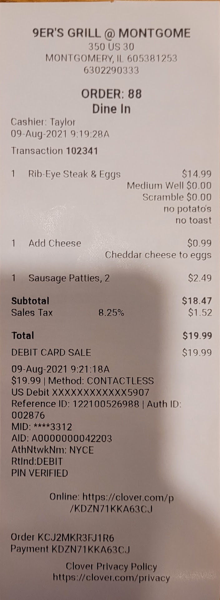 Read moreLess than impressed. Although our meal had some positives, all the negatives added up to be too much to enjoy. We stood at the entrance waiting to be seated, but after quite a bit of time figured out we needed to go place an order. Would have been nice to be directed where to go by a sign at least. The menu is massive with lots to choose from. Our items took just over 14 mins from order to our table, which can be good or bad. I ordered the new York steak and was disappointed by how far over done it was, I ordered medium rare and received medium well. The potato salad was good but coleslaw lacked flavor. Never received the salad that was supposed to come with my meal, and the dinner roll was extremely chewy. My wife ordered "the wake up toaster", the sandwich itself was very good, but the hash browns were undercooked and were wet. The kids Mac and cheese had a huge portion. The mac and cheese was flavorless but the steak fries were cooked well and were plentiful. Overall after this experience we will likely...