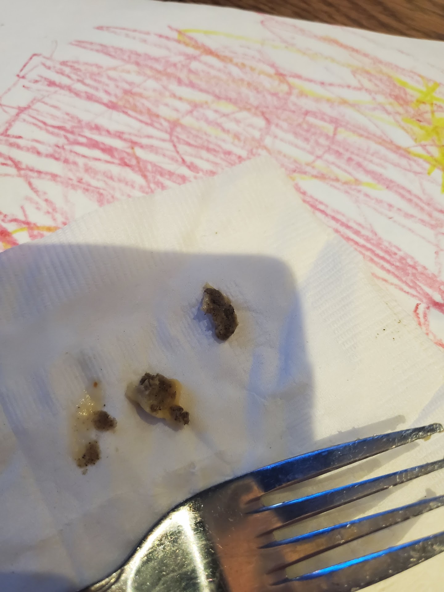 He came back less than a minute later and dropped off the new plate. The rim looked messy, and the food looked like it had been sorted through. We couldn't tell if they just checked the new plate or if they just picked out the chunks of the old one, so by this point we decided to just take our food to go, leave our daughter's food here, and then pay and leave. I didn't want to risk her getting sick so we ended up driving through another place and got her something else.