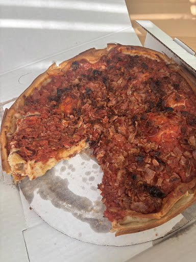 We’ve ordered a ton deep dish pizzas from this location during this period, and it’s a crap shoot if you’re gonna get a good one or a bad one. Today’s pizza was the final straw, as you can see burnt bacon scattered on top (shouldn’t it be inside the deep dish?) , a soggy, wet interior that clearly wasn’t cooked long enough, and a completely wet undercarriage. The dough was still soft and unfinished. You can see the pool of liquid/grease in the picture.