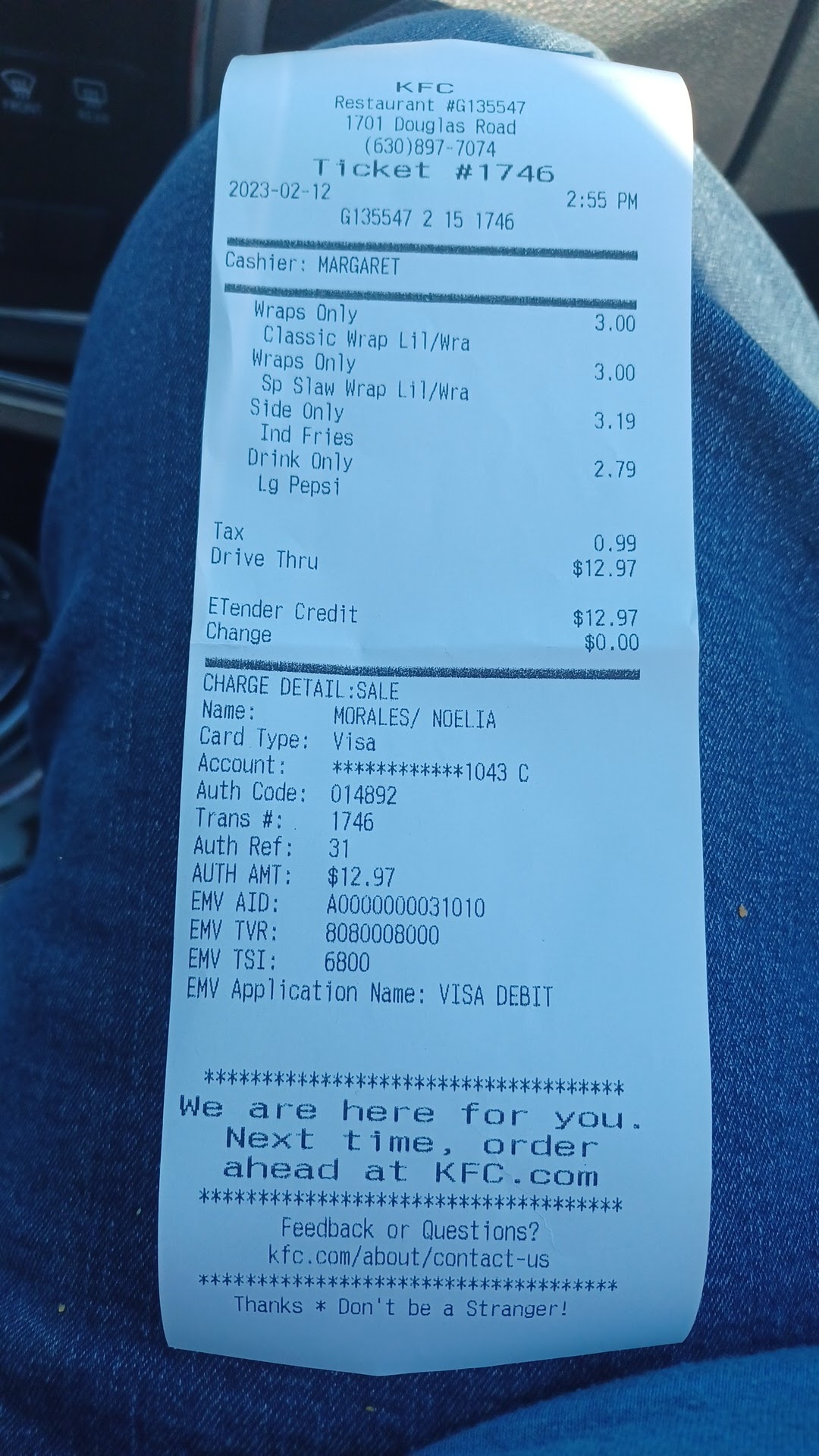 Read moreWe went inside to order 20 dollar fill up and the girl at the register said we couldn't order because they were running out of "chicken". Isn't that what they sell there? Chicken!! The manager was yelling at the girl's to make sure not to let anyone order big orderS. They gave us option to order just the 5 dollar fill up. We were gonna walk away but the girl at register told us we could order half original and half crispy. We asked if we could get mac and cheese instead of one side of mash potatoes she said ok and also paid extra for potato wedges. When we got our order got out of there and made it home only to find out that they gave us 2 sides of mash potatoes and one mac and cheese. NO POTATO WEDGES NO COLE SLAW!!! WILL NOT GO BACK AND WILL MAKE SURE EVERYONE I KNOW DOES NOT GO THERE EITHER!! BUNCH OF IDIOTS WORKING AT A PLACE THAT'S RUNNING OUT OF CHICKEN. DONT EVEN DESERVE A STAR REVIEW BUT HAD TO PUT ONE JUST TO WRITE THIS. WE ARE NOT...
