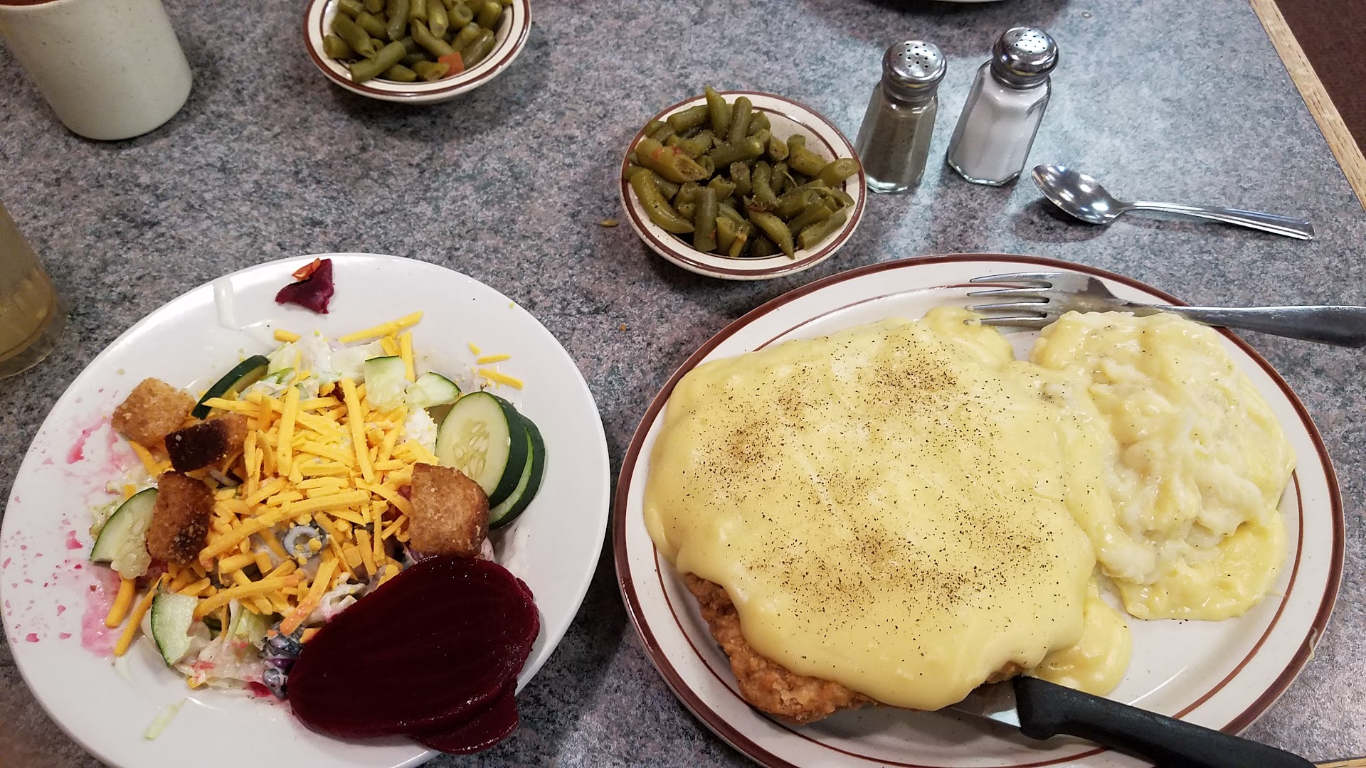 Read moreThe waitress was kind and accommodating. The food was absolutely horrible. I ordered the chicken fried steak. He had the chopped steak. Mine had this horrific pond of gelatinous goo on it they call chicken gravy. That gravy was disgusting. They took it back and remade it with "white gravy." That turned out to be sausage gravy and it was horrible too. Should have went with the brown gravy but my lord the brown gravy is disgusting too. It's not homemade gravy, I promise. His chop steak was bland as bland gets. Both of our mashed potatoes were gross as all get out. He had the brown gravy, I tasted it and it's gross. When it comes to home cooking this place fails. I could cook them out of business with my cooking. The salad bar is not much of a salad bar at all. I hate their food and will never eat...