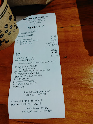 The vine has pretty decent coffee â and their coffee is pretty well priced especially at happy with is from like 2pm-5pm during which you can get half priced coffee which is great because who doesn't love getting perfection at half the price.The vine also has amazing grilled chicken and chicken salad sandwiches which you can you get on one their amazing bagels or you can get on some of their bread đ oh and you can also get lettuce and tomatoe and probably onion on their chicken sandwiches but I would leave the tomatoe alone because I think it tasted a little đ§ watery.The vine also has amazing pastery such as their sugar cookies which taste like their out of this đ world and are pretty decently priced at 75 cents a pice some of their other amazing pasterys are their awesome muffins.besides those awesome pasterys and sandwiches I mentioned they also have amazing soup đČ and tons of other amazing sandwiches and pasterys.the vine is also not just a coffee they also sell a wide variety of other drinks such as tee and smoothes.so weather you need a good morning pick me up a great lunch some amazing dessert or just a snack stop at the vine where their coffees always fresh and their menus even fresher.by the way if you've made it this far thanks for reading and I appreciate all of you who help to support our local business cause trust me when our mall can't keep stores we really need the other...