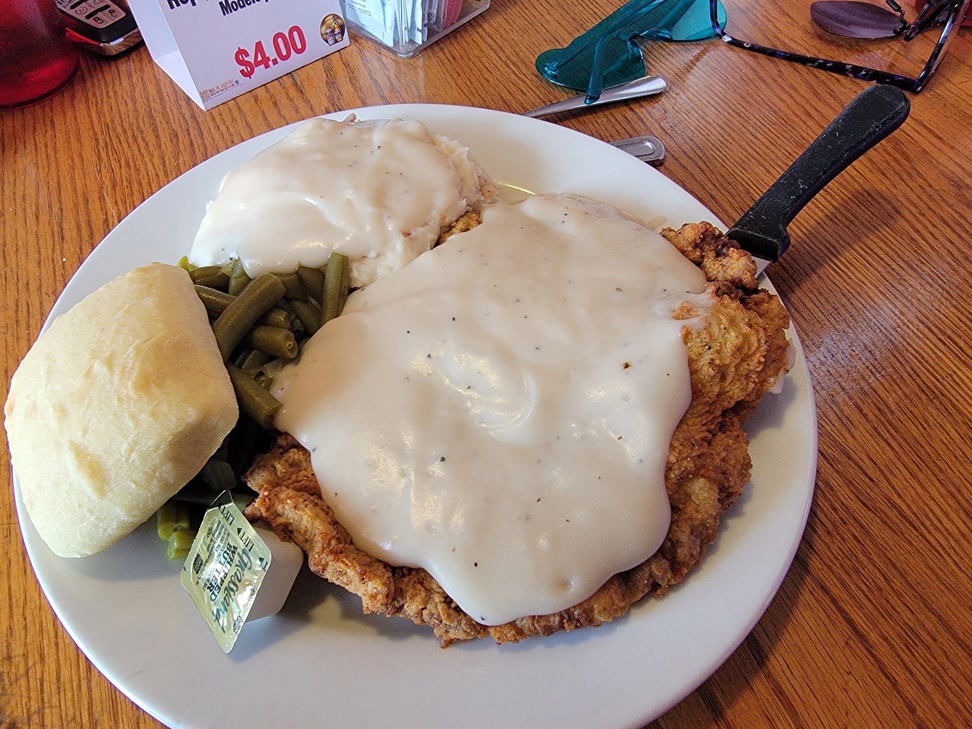 My chicken fried steak with mashed potatoes and gravy (I also got extra gravy which they thank goodness gave me on top of my steak and potatoes!) I'm so glad they didn't give me a separate dish for my extra gravy.my chicken fried steak was amazing probably the best I've ever had. The buscuit/bread was so fresh and amazing.