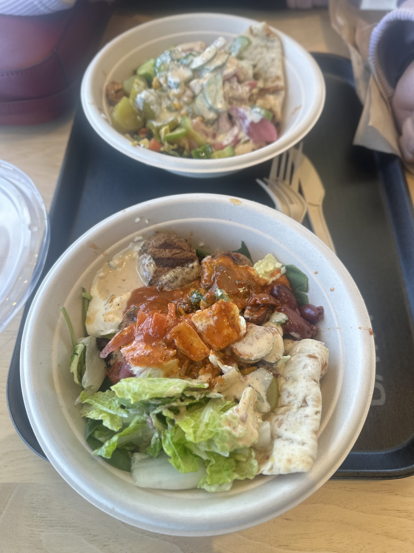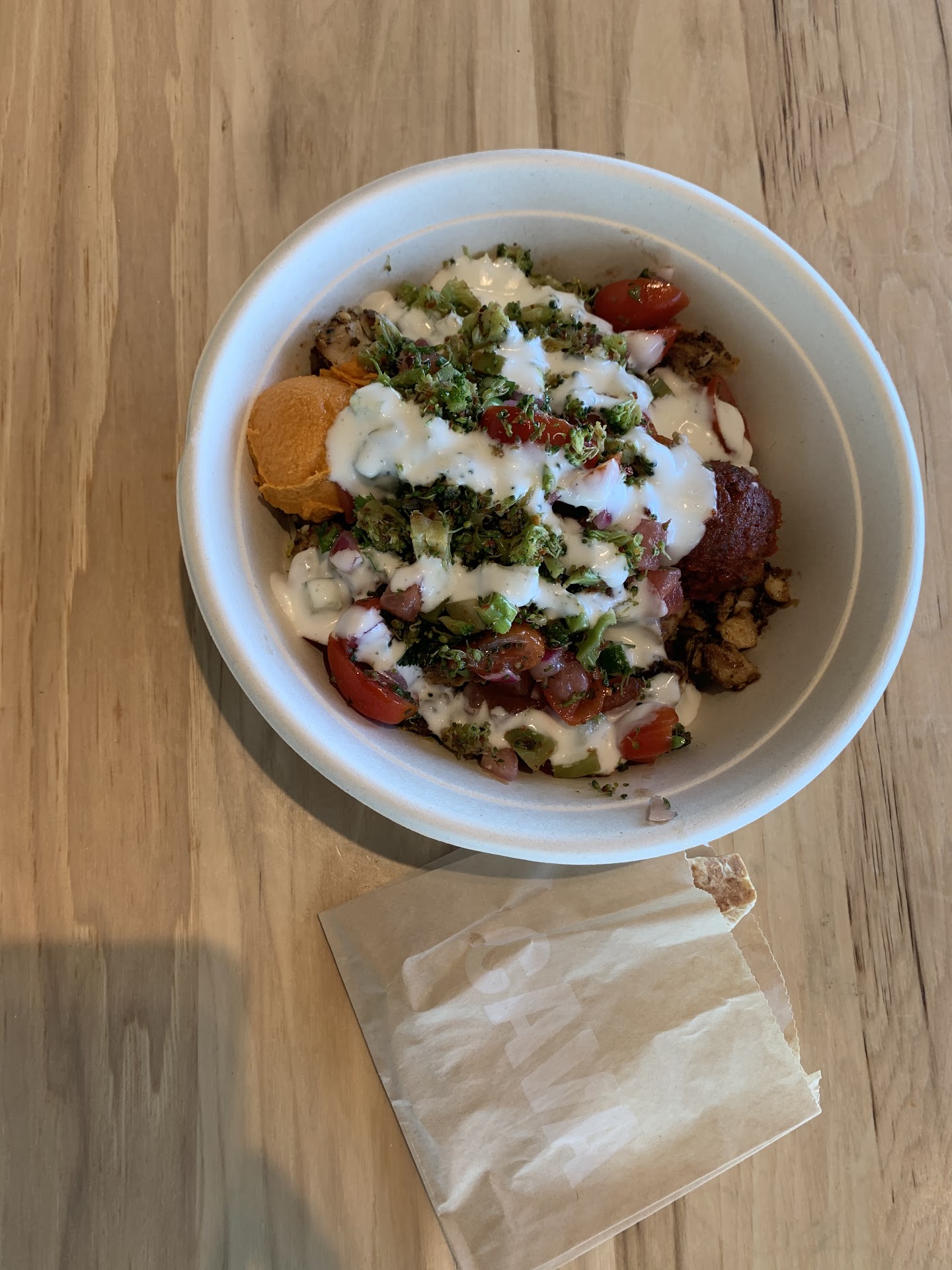 Unfortunate parts of our visit included a 30 min wait to order with only 5 people in line in front of us, no readable menu descriptions of anything until it's your turn to order (guaranteed to be slowing the line down), very slow service from the initial bowl/pita builder, and they were out of tzatziki & yogurt sauce, a main feature for this style of food for many. We would have left if we knew that beforehand. The whole system behind the line and in the back looked like literal chaos, and I didn't enjoy the ordering process at all. There were no napkins present in any dispensers, and all the tables were dirty. (This was at 8:00 pm, so the dinner rush was long over).