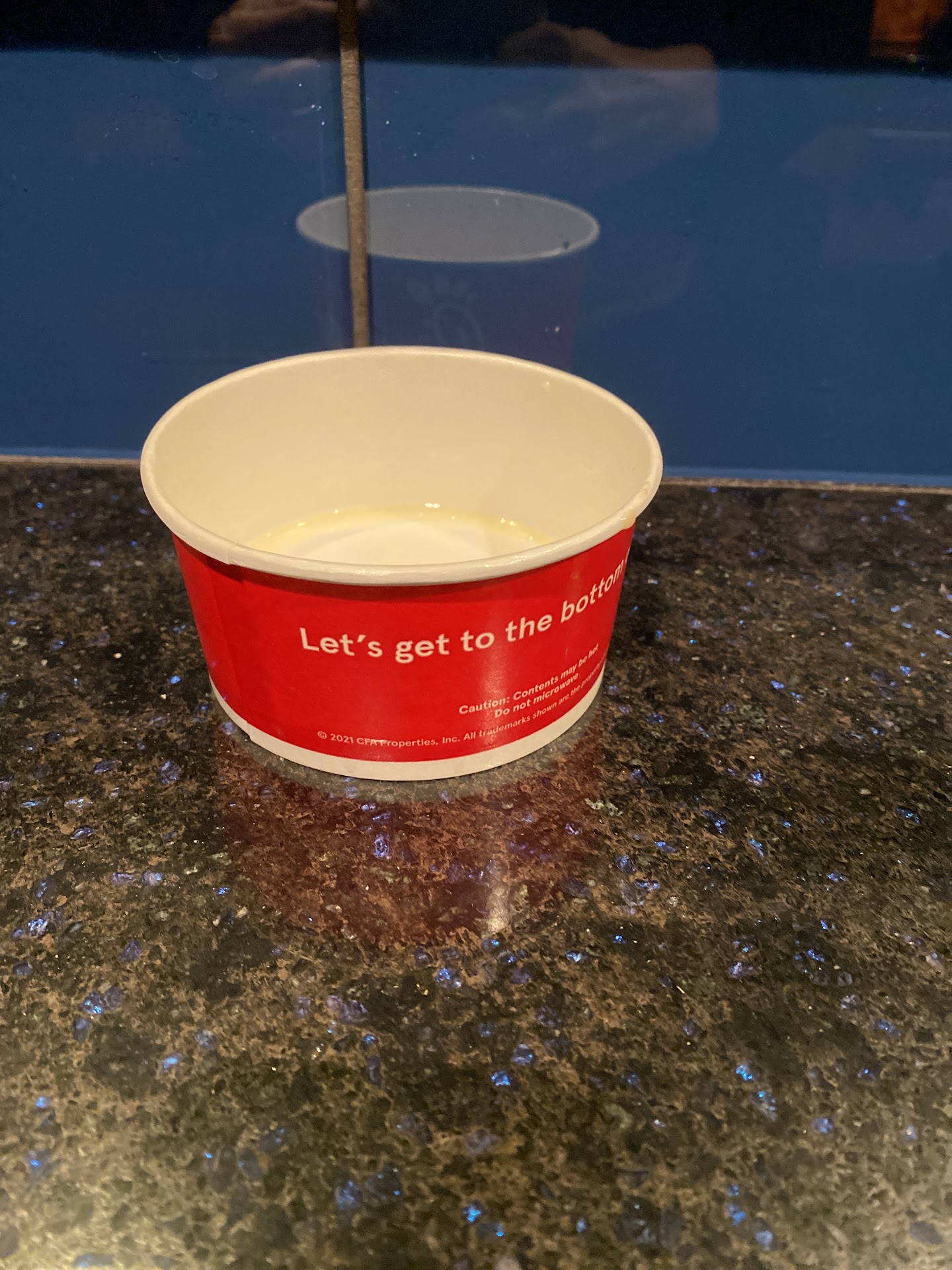 Read moreThis location used to be great. I’m not sure what happened. The line was extremely long and from my experience in the past, it always moves fast, but tonight I waited in line for about 30 minutes. I ordered 2 large shakes and a large cup of vanilla ice cream. When I finally got to the window they told me they only do small. I told them I’ve gotten large before. They said the haven’t done larges in about a year and a half. I asked if they could just used a fountain cup that is larger and they said they only do small. It basically was just argumentative back and forth and they weren’t willing to give me what I asked for. When I ordered at the screen and said larges, no one told me they didn’t do large. After asking for a manger and going back and forth with him, he decided to give me another small shake. Why not just put them in a bigger cup and add a little more? Then there would have been a happy customer a lot sooner! The line was held up even longer by this ridiculousness. They were unpleasant and not willing to do the right thing for the customer in the first place. It didn’t seem like the same Chick-fil-A it used to be. And then once I got to my destination I realized I didn’t get straws or a spoon. Photo is a picture of the small vanilla cup of ice cream (that was supposed to be a large) I ordered for my mom. It was about the size of a kiddie cup you might get at other places and took her about 2 bites to finish.