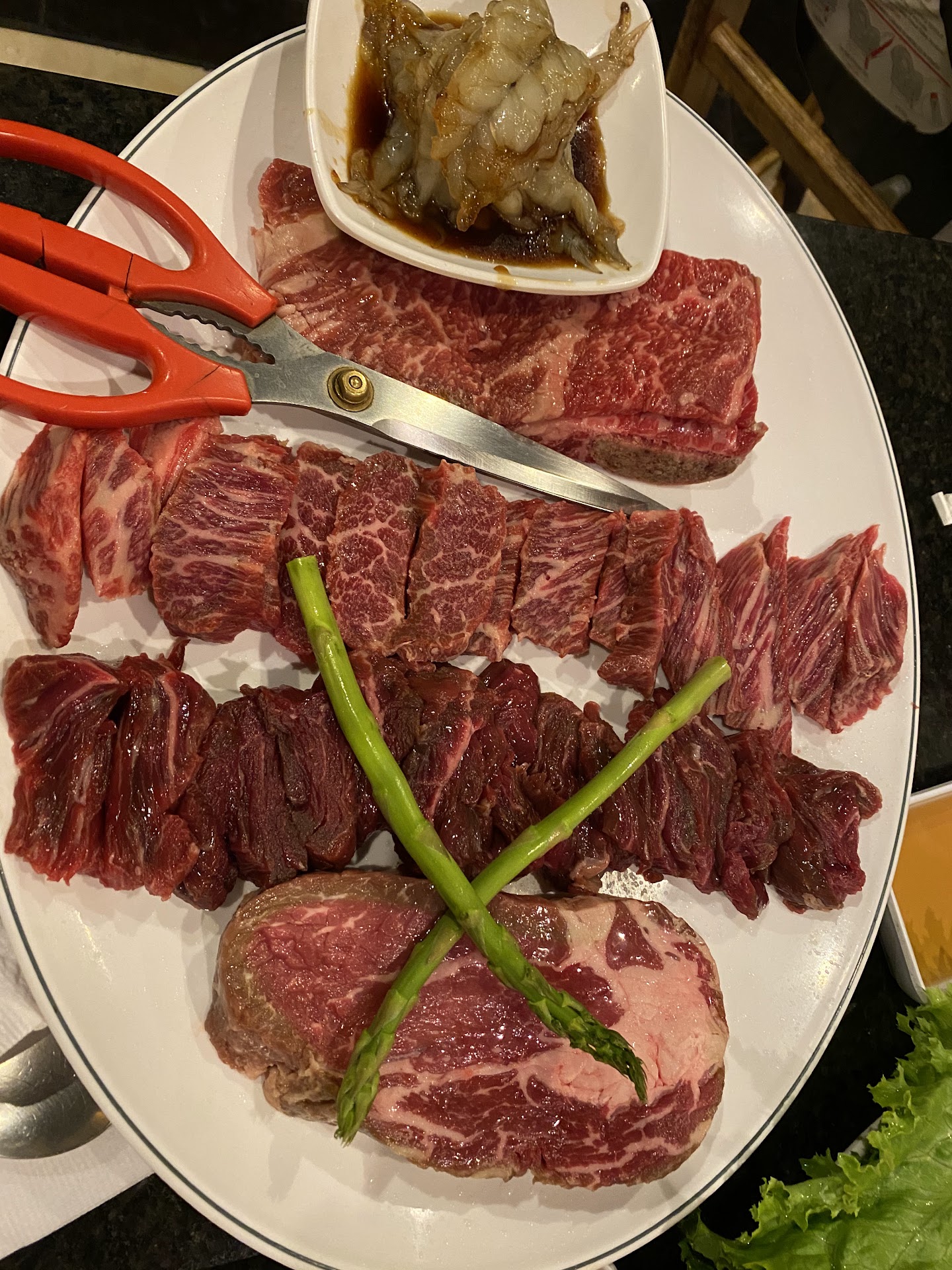 When I do Korean BBQ in LA or Chicago there's at least 8 or more different dishes. This is Kansas City, but still a bit of kale, 3 small broccoli florets, daikon kimchi, cabbage kimichi and some kind of hot dog kimchi don't really cut it. Where are the pickles? Where's the tofu? A missed opportunity I think.