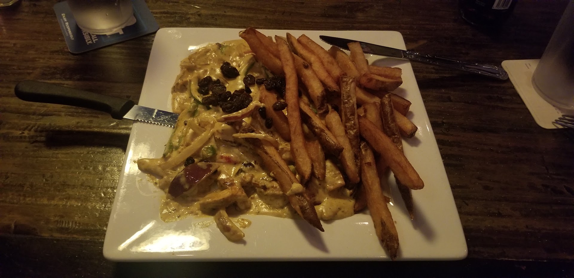 I had Irish Chicken Curry and chose fries (rice was also an option). The vegetables in it as till had some crunch to them, and it was topped with - raisins! At first I thought it was good but a bit plain, but halfway through the plate I was amazed! I believe I am so used to curries having heat that I was caught off guard. It was an exceptional dish and I'm craving more as I write this.