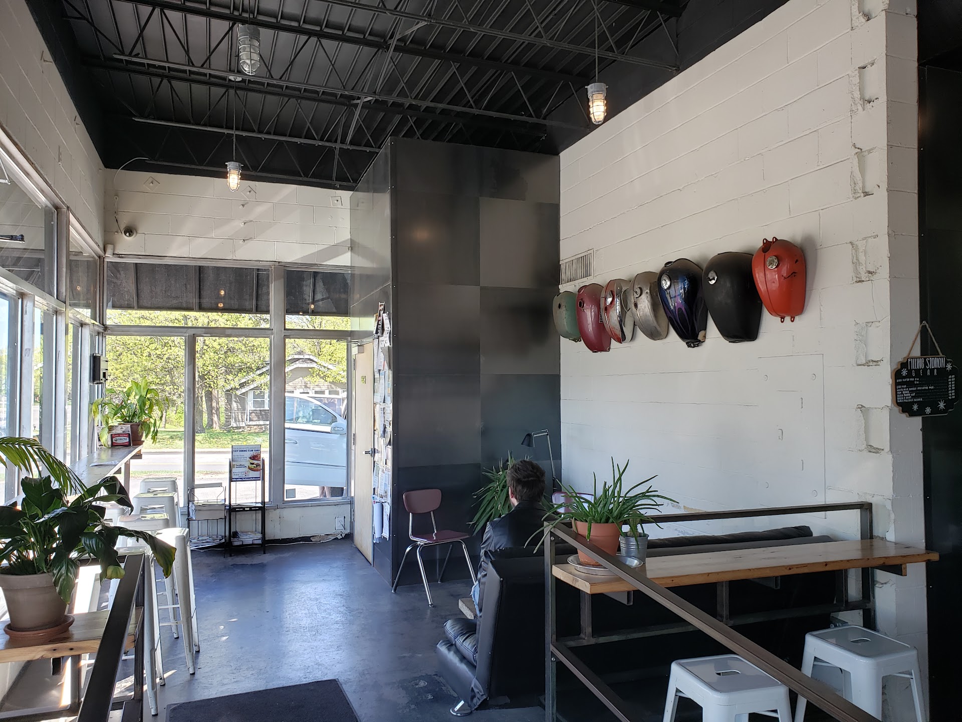 The old garage aesthetic was fitting and evident as you enter and observe colorful motorcycle gas tanks hung artistically along the welcoming wall. Industrial chic stylistic overtones in both furniture and accent choices emulsify into what is the Filling Station brandology. The aroma of the brew reeled me into the counter like a subservient sea bass on the hook. An overhead menu was clear and concise which made my choice for a Md Coffee and a Veggie Clutch Burrito an easy one.