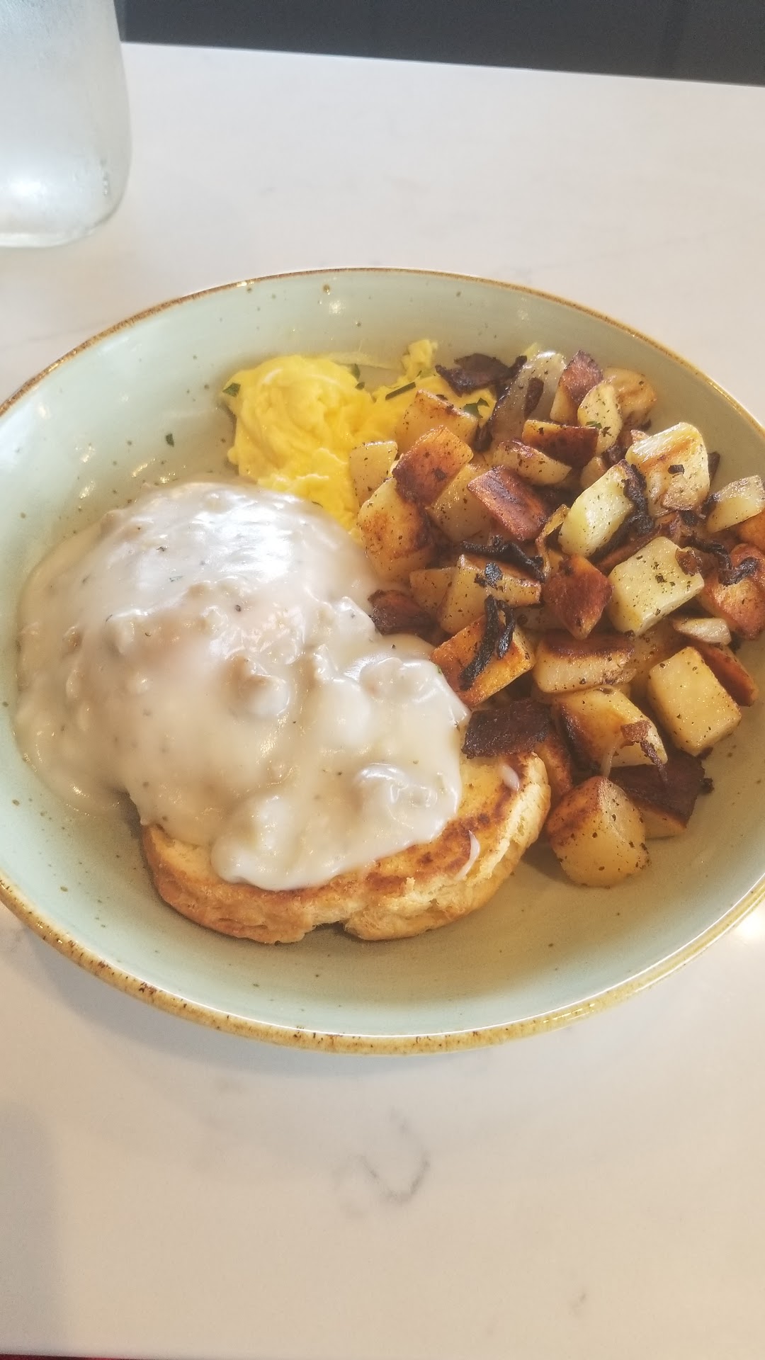 Food was absolutely fantastic. I ordered the biscuits and gravy with eggs scrambled. The lady next to me heard my order and changed hers on the spot. Malarie, our server, immediately told the kitchen. Their plates and mine landed on the counter at almost the same time less than 10 minutes later. Outstanding service from the wait staff and kitchen.