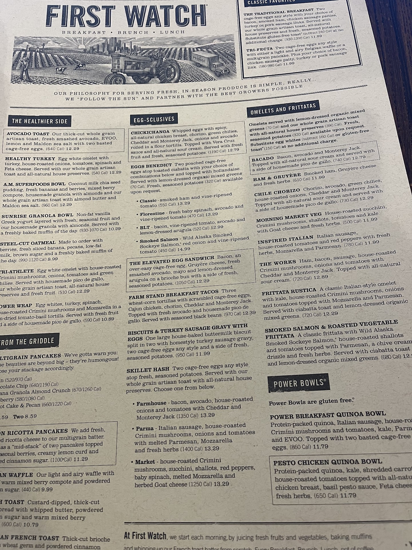 Read moreHow can you go wrong at First Watch? This restaurant is one of my absolute favorites places to go and especially to bring people to when visiting the Kansas City area. They have something for everyone. For those who enjoy a traditional one or hearth breakfast they have classic plates with healthier alternatives than most breakfast joints. For someone who wants to be me more adventurous and try some thing new this is also the place to go with to try. Also, they have a seasonal menu that showcases limited time editions which is always fun to see what their latest creative dish is. I highly recommend the Pesto Chicken Quinoa Bowl and the Farmhouse Hash. Honestly, whatever you get here you can’t go wrong. The one item I would say to save your money and go with something else is the Million Dollar Bacon. Does it taste great? Of course. Is it worth the cost? Not...