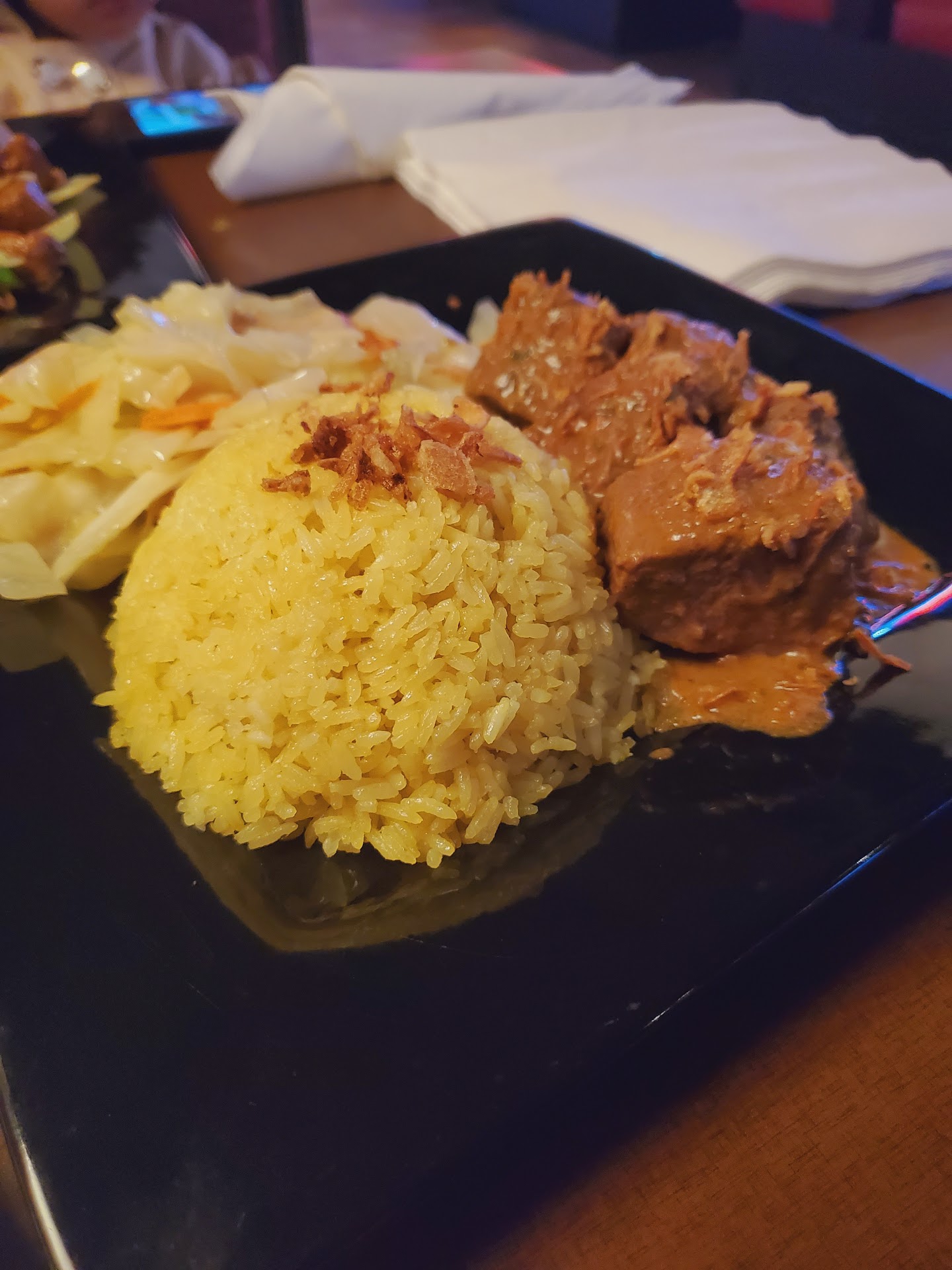 Read moreThe food was okay (everything is Halal except turkey leg). Nothing mind-blowing. But it did seem a little overpriced for the amount of food you get. (8$ for 5 small egg wraps??)The previous reviews said otherwise, though. Also, the food was nothing like its description. We ordered- fried chicken noodles(17$) 6/10, it was supposed to have eggs, tomatoes, cucumbers and what not and topped with fried shallots,but as you can see it was nothing like that. Rendang with spicy beef (17$)- 6/10, it was not really spicy, and they reduced the amount of rice and added cabbage and carrots, which did not taste great. So we were a little bumped. Egg wraps - 5/10. The reviews and pictures were so good that we were really tempted to try this place. It was our first time trying indonesian food, too, and we drove for 45 min to get there. Anyone reading this should know that currently, the food and amount is nothing like what it used be probably (atleast thats what I understood from reading the previous reviews) Go at your own discretion. But at least they did have Halal food, which is great👍 . The girl waiting on us was nice and friendly. She tried to answer our questions as best she could, but she was new though, so she just didn't know a lot of things. But...