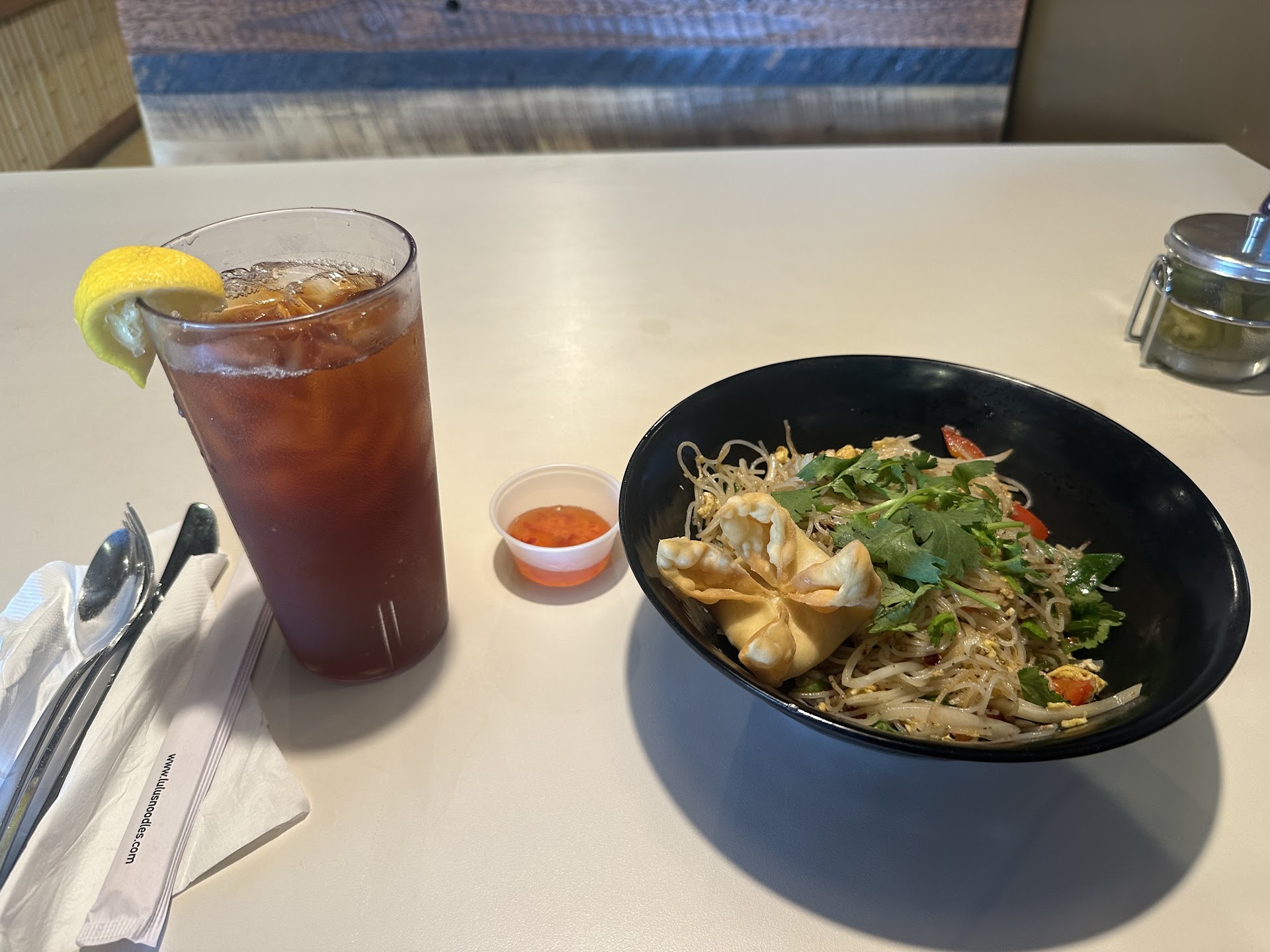 Food is good, but not great. It's consistent with Lulu's in the Crossroads. The house Pad Thai was oppressively sweet. I expected a little more spice in my "hot" dish. The fried pork dumplings were, again, good but not great. I think I would've preferred them cooked longer to get a little crispier. My partner's Rainbow Noodles were fine, but unremarkable and a little mealy.