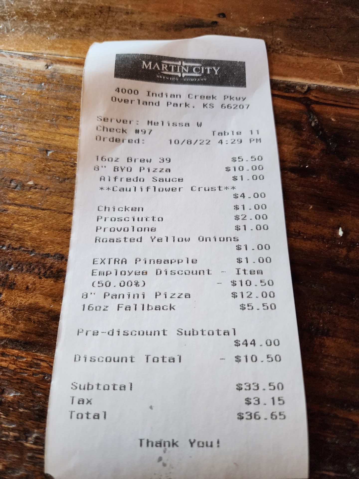 Melissa did apologize for my pizza being disgusting, and said "I'll take that off your bill!" When she came back with our bill, she had taken $10.50, off the bill. My pizza had the following cost 8" pizza - $10 Cauliflower crust - $4 Each additional topping $1 Chicken Prosciutto 2x Pineapple Roasted yellow onion Provolone So that is $21! If you say you're going to take it off the bill and you don't have that ability, then talk to your manager. (See Bill picture below)