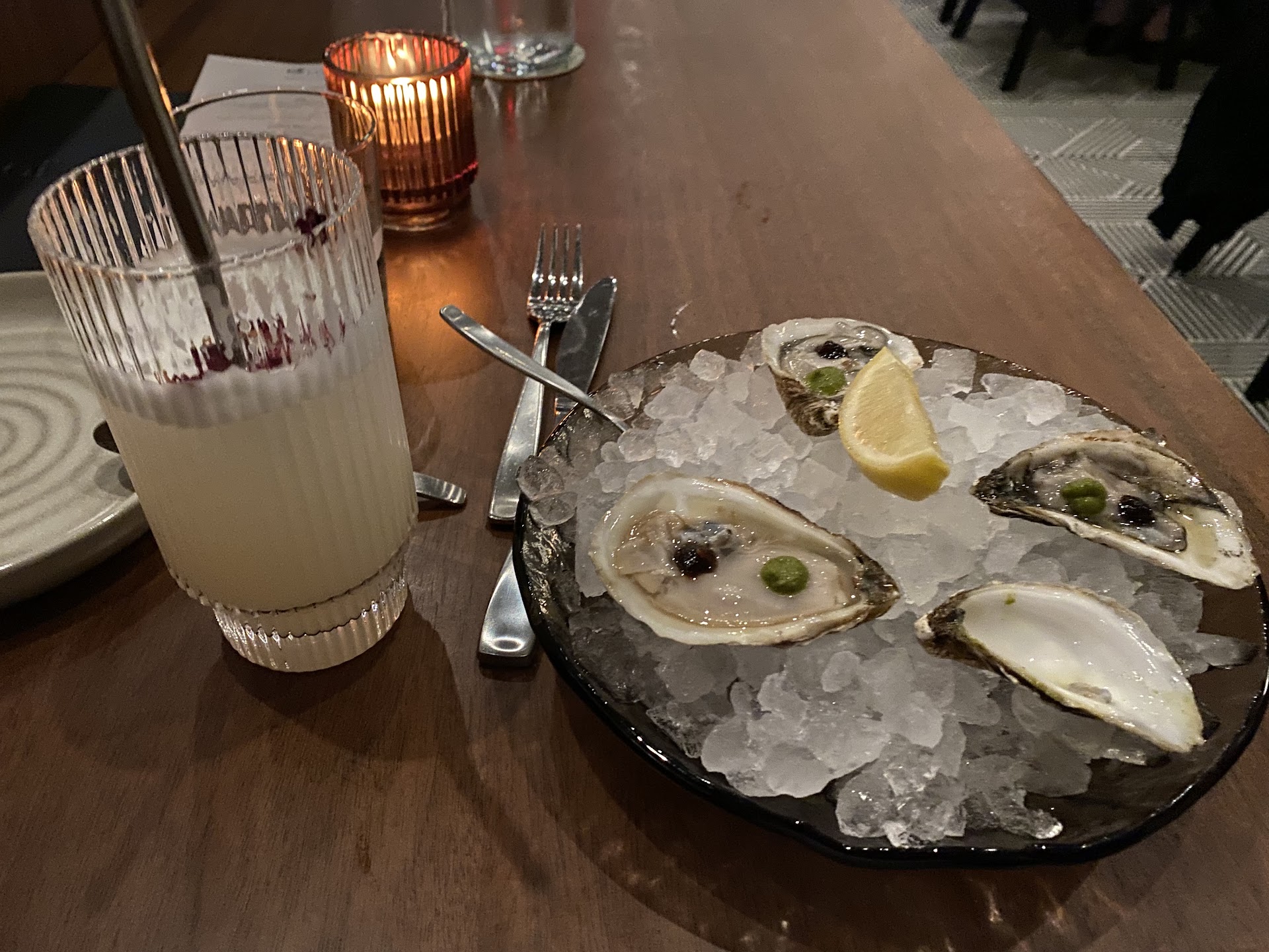 Since I was dining by myself today, I decided to treat the plates as if I was eating a 3-course meal. I started with a cocktail called Wish You Were Here (a gin-based cocktail), then ordered 4 Oysters and Lamb Ragu before ending with the Toffee Pudding Cake.