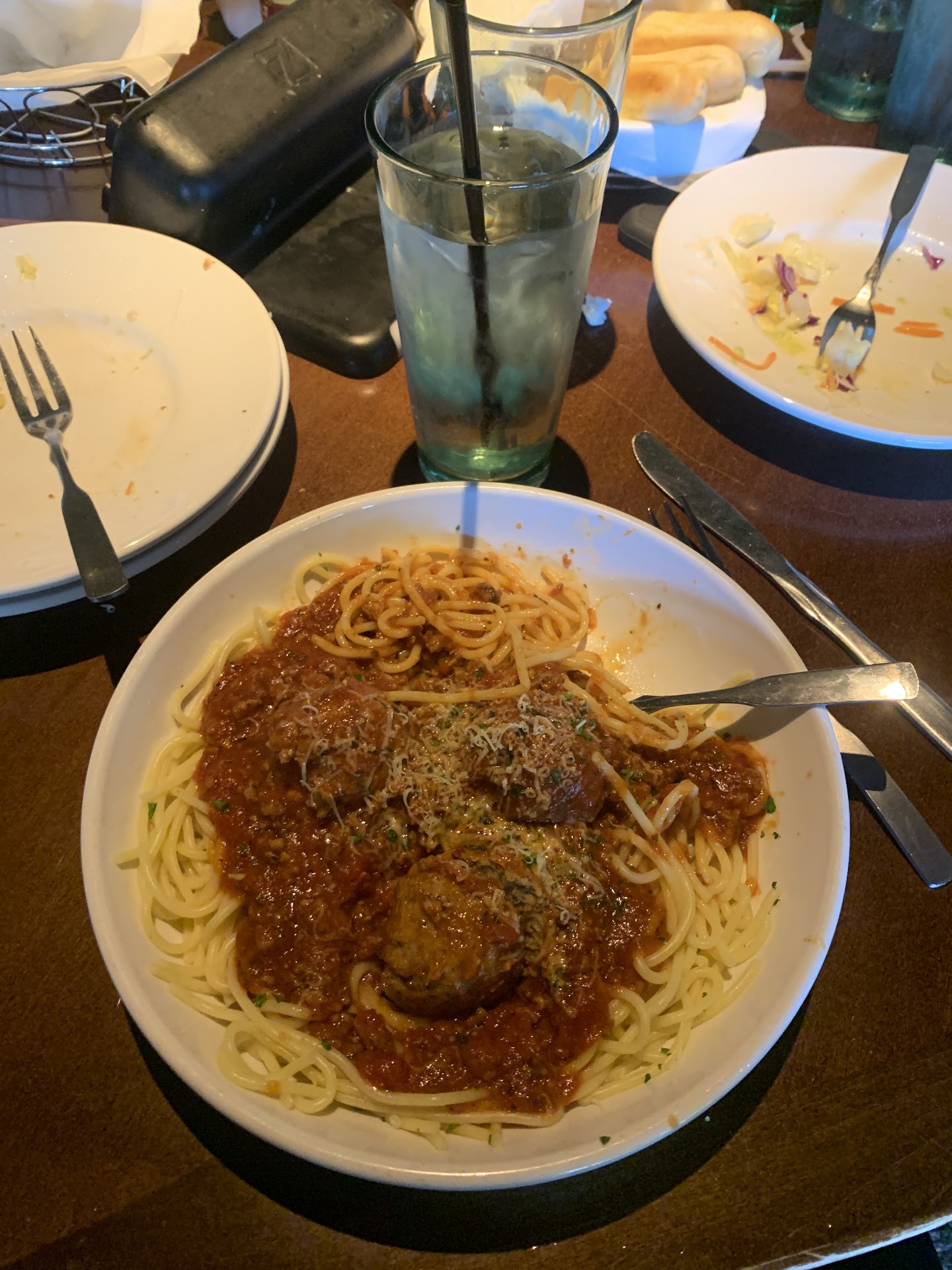 Read moreOlive Garden is NOT how it used to be. As soon as the breadsticks cool down, they're hard - like they had been heated up constantly throughout the day. The salad - which I wasn't told beforehand - is apparently an extra charge and does NOT come with the main course? The menu says it comes with unlimited salad and breadsticks, so why it showed up on the receipt as extra is weird... The waitress wasn't terrible - she did everything right... IF this was iHop. It didn't FEEL like a nice restaurant at all! She was always needing to be summond and would come to our table to drop things off but was terrible at taking empty cups or trash (so our table was FULL of trash and food... yuck). She seemed resistant to letting us order food for my kids and then keep the menu for myself to order after i had time to think (and yet still gave me my food first... no! I purposely wanted my kids to eat first!). She didn't really seem to care what was on the menu and never recommended anything with knowledge and enthusiasm - like a nice restaurant should. And the most AWKWARD part was where she had been absent for most of our dinner, she wouldn't leave us alone when I was trying to pack my kids food into to-go boxes - she didn't help - just offered, I declined, and then stood there... I knew she didn't want to help; the real reason she was standing there awkwardly - staring me down - was because she didn't want to leave till she saw me tip. Which was incredibly unessessry because I had a tablet that I paid from, at our table, and didn't need her hovering over me. There's no reason to tip when you're being bullied into it. A tip should because you're service was actually GOOD and I want to say thank you; not because I'm being bullied into it. There was barely anyone there and so for some reason a cleaner - with a huge cart of cleaning supplies - kept walking back and forth by as we ate (he didn't clean anything in the vicinity of 20 tables anywhere near us......