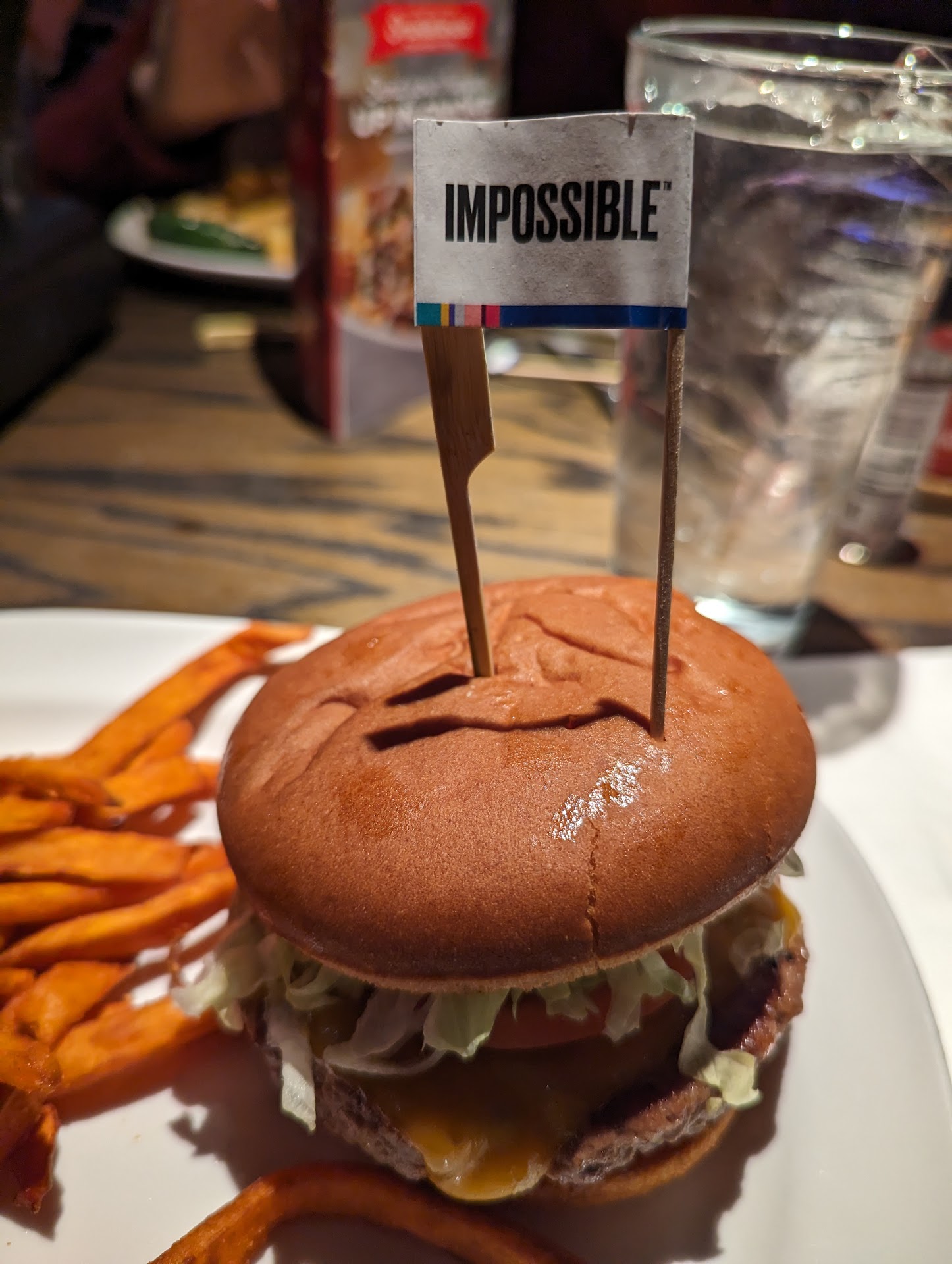 Now, the food. We have eaten A LOT of Impossible burgers, and my husband said this place has the best one he's ever had. (He had the Burnin' Love burger with Impossible). It was nicely charbroiled and cooked to perfection, with a good ratio of toppings to burger. And the garlic fries, oh the garlic fries. So good, topped with actually bits of garlic and garlic oil. I ordered the regular Impossible burger and it came with a tasty relish, tomato, onions, and lettuce. Everything was fresh and crisp, and the sweet potato fries were thinly cut and crispy, too.