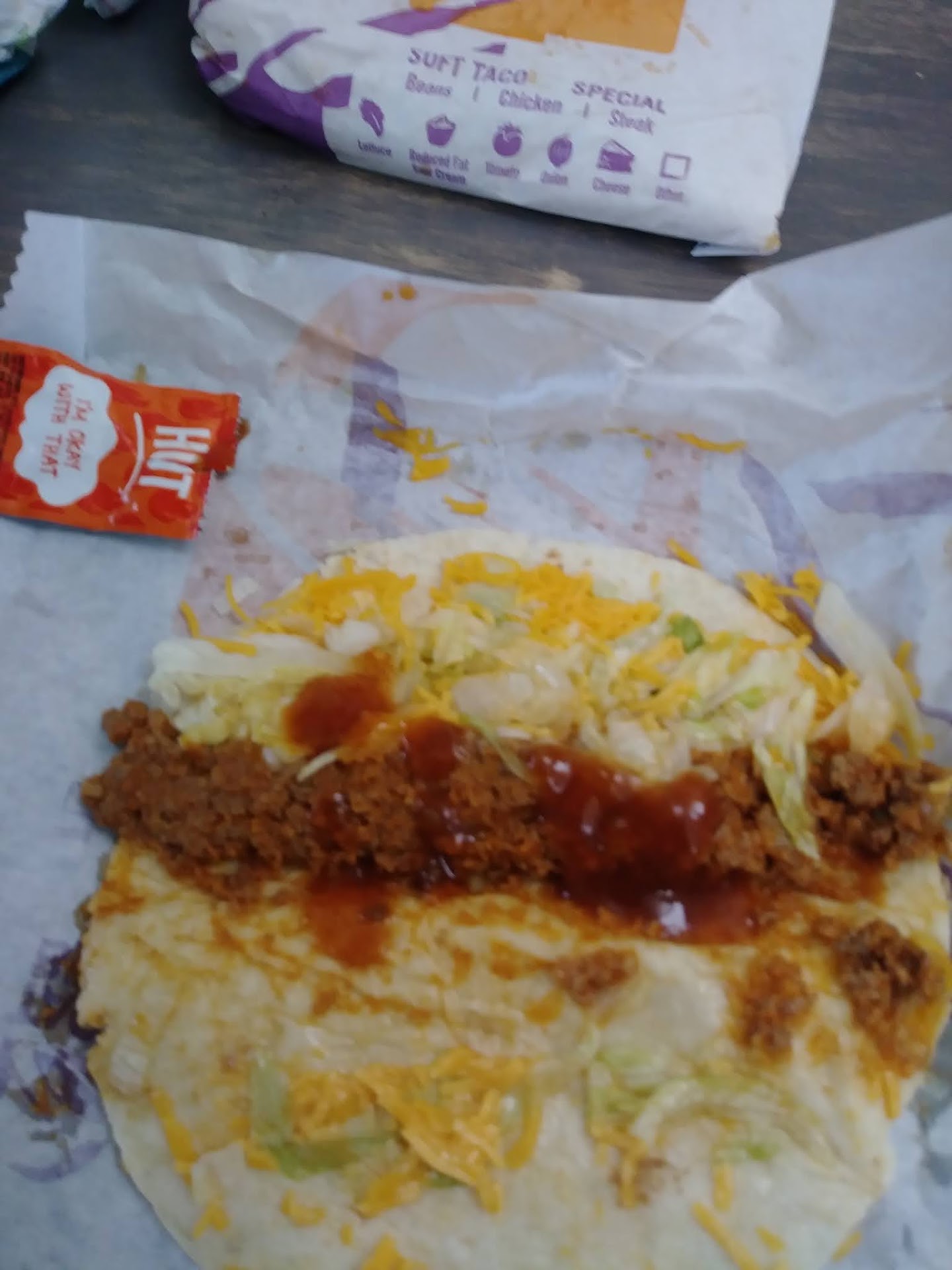 Read morePlaced an order online. Received the text that the order would be ready in 10 minutes and food is ready at the same time. Food was done 10 minutes early, so by the time we got home the food was cold. The burritos were thrown together and fell apart while eating. Potatoes in the Fiesta Potatoes were hard. Tacos were half full. Mexican pizza not cut and also barely had anything on top or in the center. NO customers in the drive thru and one customer leaving when I got there. So store was NOT busy. The guy at the counter was nice enough. Acknowledged me when I walked in and nice when he came to the counter. Tried this location again, and disappointed once again. Will never be back. Half full hard tacos again. Soft tacos were suppose to be supremes and were not. The steak quesadilla was a quarter full. LIke eating a dry shell. One bit of cheese in each section, with one 3 pieces of steak in the...