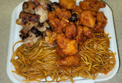 Without hesitation, we ordered... 2x two meat plate with two sides. Both meals with bourbon chicken and orange chicken. They proceeded to make our meat options fresh to order from the kitchen (Not something you typically expect from a food court)! We loved it!