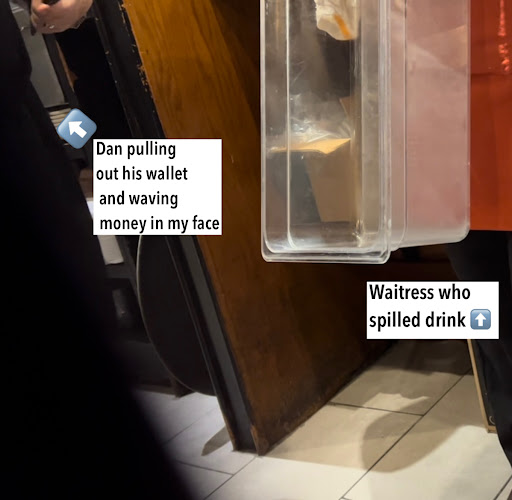 PART ONE : My party and I had come to enjoy a nice evening out . We got here at 7 pm. I went in to get a table. A male hostess with brown hair and a blonde girl did not even greet me but were speaking to each other . I greeted them & proceeded to ask for a table of 7. The male told me sorry we can't seat you. I said "oh why not ? " He just told me there was no seating at the moment and won't be. Another member of my party said they called & there were tables open. The waitress had then spilled our drink all over my partner and some on me. She just expressed she was sorry. This was honestly terrible because my partner had a meeting to attend soon. He was not going to stay the whole night. He ran to the bathroom to clean up his uniform . The waitress brought towels and napkins to try to clean up & I helped her. She offered an appetizer for the inconvenience as he spent the whole time 20 minutes cleaning and drying himself in the bathroom. I declined as I said he needed to leave very soon. She told me ok and apologized again and in light of the situation( I guess?) told me " good thing I didn't spill it ALLL " while chuckling. The drink was still half full but I asked her for a new one please as her finger had completely broken the lid and went into the drink. She said okay took the cup replaced the lid and just gave the same cup. My partner was gone by the time we ordered and got food. Everything came out about fine. Some soups / entrees were cold but we were starving having already waited 2 hours. Everyone began eating we got sides reordered for about 2 dishes just chicken that was cold or side pasta. Everything tasted great now! By this time a lot of us had food but no drink refills at all. After we ate my partner had returned. This was around 9:40 . The waitress didn't acknowledge him or approach him to get him anything bread , water , dessert as he had not been able to order and eat earlier. There was still the event going on with about 5 tables next to us that people were still ordering. She had said the kitchen will be closing soon . They were doing a drawing for a basket of some sort but also still getting food. When the bill came we noticed nothing was taken off but also unfortunately she didn't offer dessert for at least my partner that was still sitting with nothing . We also never saw a manager just to apologize for everything that happened. Having paid over $300 within our party a member of my party decided to approach the waitress as she had left the checks for 10 minutes & never came back to pick up anything or offer dessert menu. She then told the member of my party no one looked like they wanted dessert & also told me you said you didn't want anything & just said sorry she didn't recognize my partner next to me. The manager came over because she signaled him. By this time there were still other guests and he said They're closing they don't have anything even dessert available. He didn't seem sorry about anything and as I was speaking , he pulled out his wallet and waved it then pulled out 2 $5 dollar bills in my face. I was horrified as was the member of my party. He said "take it " I don't have anything else ." I was shocked this was how he was behaving in front of other guests and the kitchen staff and waitress. The waitress even lied and said " I only spilled a few drops". Which made the manger more confused. He angerily grabbed a to go bag told the kitchen staff to box a cake and told me "HERE." I was so stunned. I luckily was able to record part of this interaction because I really believed he was going to throw something at us. I believe Dan the manager...