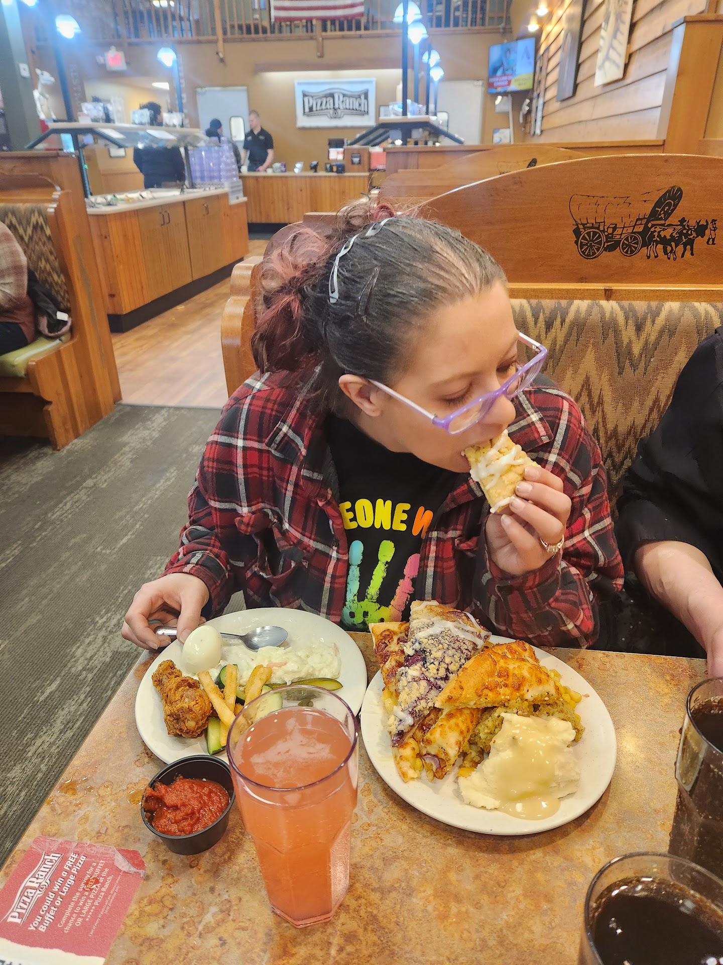 Read moreThis is the 2nd Pizza Ranch I have been to. I paid before letting the homeowner's kids and their southern cousins loose to the buffet. Cody, was cashiering and maybe was having a bad day....idk nor do I care. I dropped $80, and the LEAST he could have done was say thank you or thanks, or how ever he could muster up a cordial act of appreciation because my purchase helped keep the doors open at least that night. I was surprised the 10 yr olds were charged the price of an adult. So, I don't think the 3 thin crusted, thinly sliced pizza that they each consumed along with a slice of dessert is 13 bucks worth. We came as the dinner rush was coming to its end. And noticed they didn't have a big selection of pizza, in fact 3 of the same kind were on one side. I opted for chicken and mashed potatoes which was a scoop full at the bottom of the barrel. They did replenish both of those near 20 minutes later. The potatoes chowder had a crusted film on it and no one was around to ask for more. One bus person cleaned up after the locals who had treated the dining area like a all you can eat throw down circus, sitting there giving their gut time to settle so they can eat more. Made it a definite go to the other location which I find I won't do since I don't live in the area. This experience could have been so...