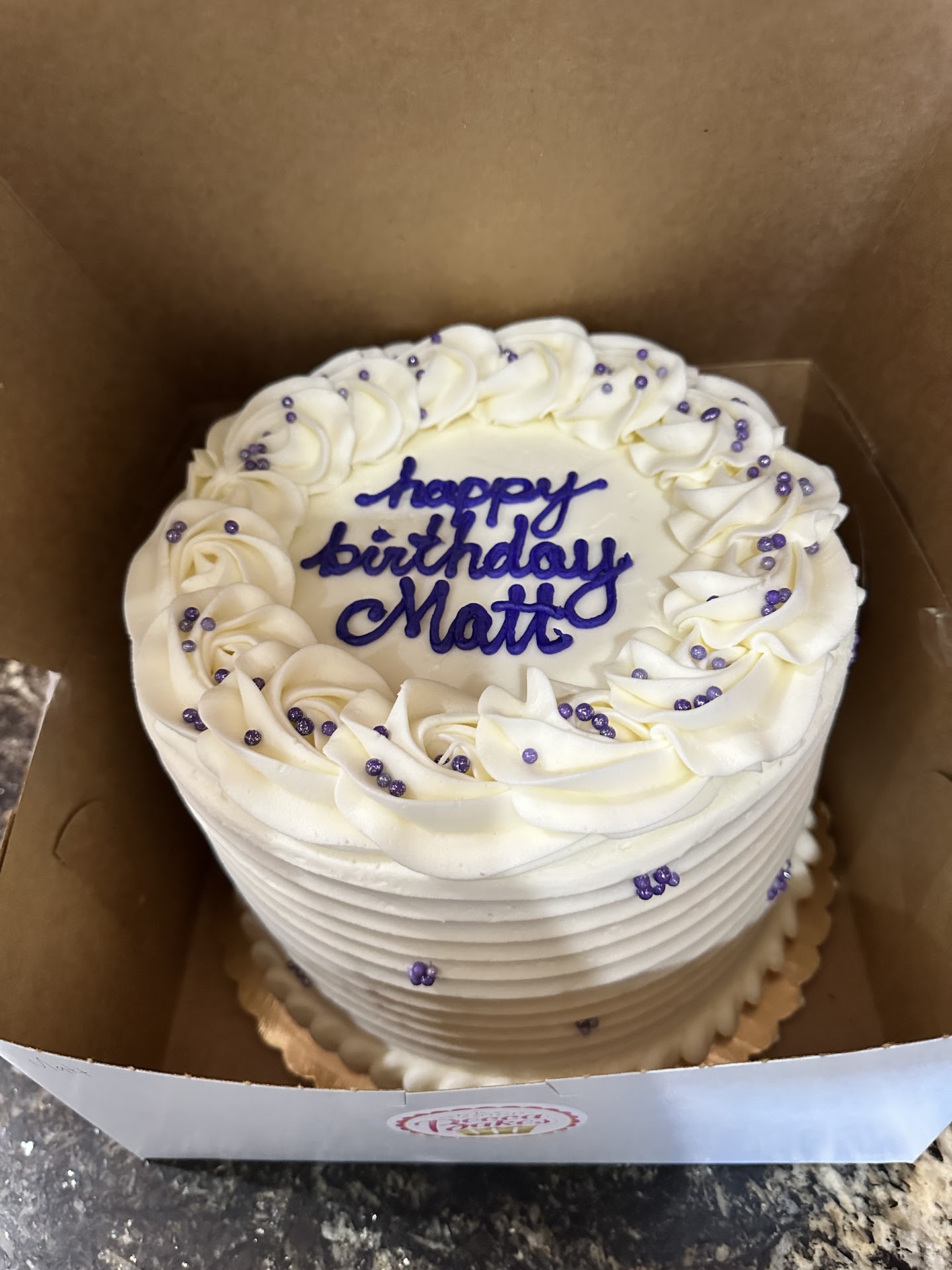 The cake we had agreed upon was all red, with a black drip trim, black lettering, his team logo, and âHappy Birthdayâ with his name & age on it. Instead, we received a white cake, with the dripping detail & logo, with no name/age/Happy Birthday. It literally looked like they had forgotten our order until I texted the day before, and used a cake they had previously prepared for another event and just threw on a couple of details we asked for. The style of cake didnât go with the theme we were going for so it just made for an awkward looking cake. The cake was very dry inside, another reason why I think it had been prepared ahead of time.