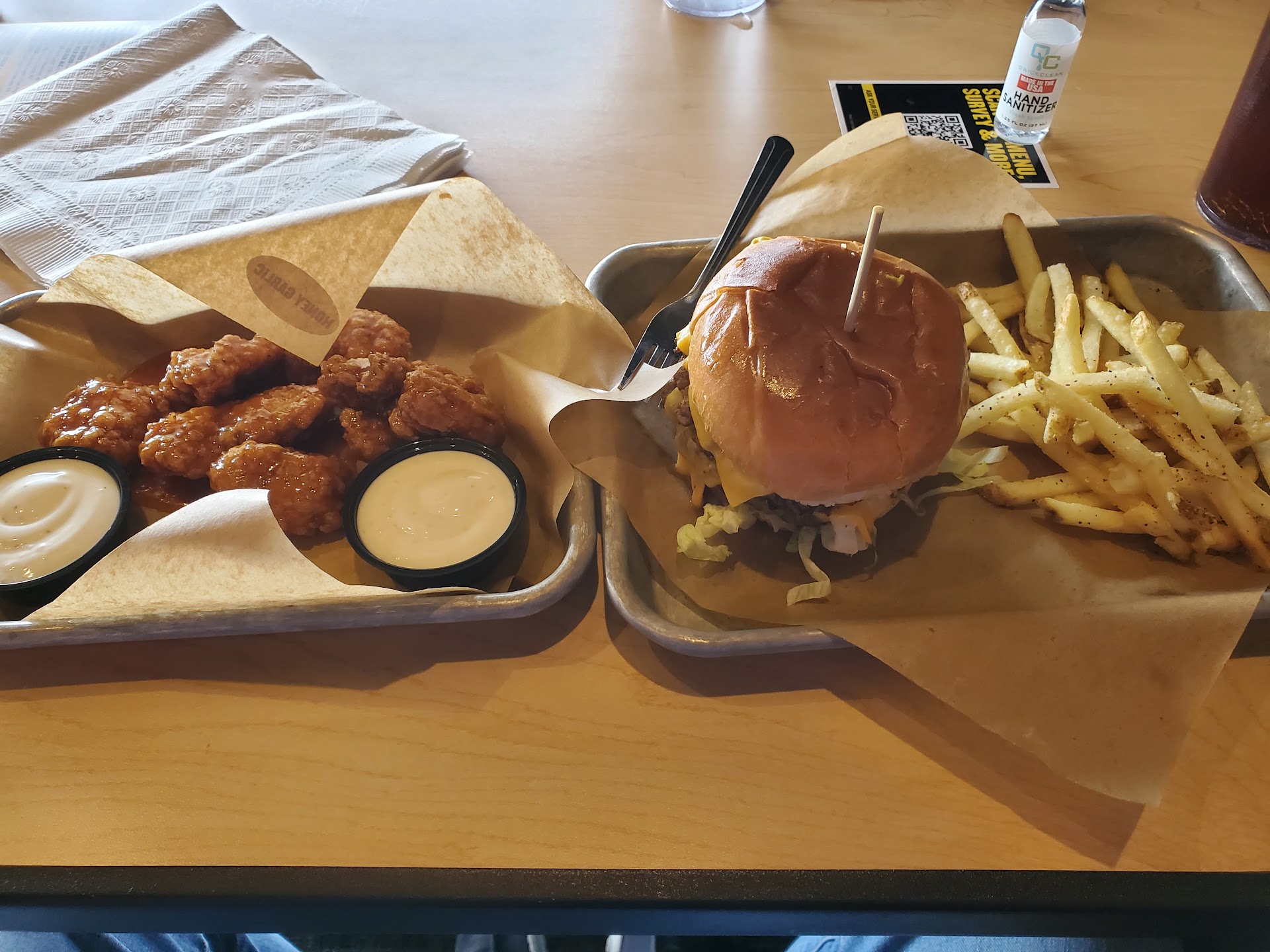 We also ordered the all American Cheeseburger with the sauted onions Mayo & Mustard on the side which comes with shredded lettuce, Pickles,Tomatoes and fries. I also ordered a separate order of Tater Tots. The fries and tots were good and were a bigger portion than I expected which was fine, but again nothing special. The burger bun was tasty & toasted but the burger itself (which is a double, they all are) was in pieces and falling out of the sandwich. It was jucy and tasted OK but very messy. I've never had a burger served to me literally pieced together like that. They did not put the grilled onions on it and did not send the condiments so instead of complaining we made due by using the ranch that came for the wings which was fine. But again disappointing.