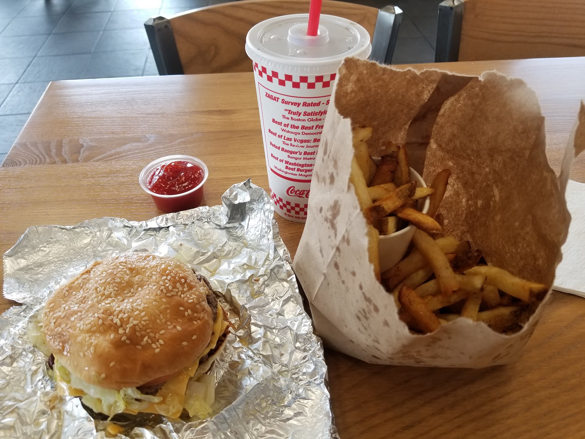 I have always said Five Guys is THE place for burgers and fries (AND hot dogs, AND grilled cheese, AND milkshakes) but I have to say tonight was excellent! Fast and quick, they can almost ALWAYS have your order ready in about ~8-10 minutes and it will be one of the freshest, tastiest burgers you can have! All ingredients are fresh, they tell you where the fries of the day are shipped from (as potatoes, mind you! They chop em up at the restaurant) and they fry them in peanut oil for the healthiest tastiest fries you could ask for! The burgers are always fresh meat, never frozen, and the juicy flavor really tells you that, hands down! One thing I always hear is that they're too expensive, but I always say, only if you're comparing them to McDonalds!!! The biggest, baddest burger costs under 8 dollars, and that's with two patties, lots of gooey fresh cheese, and the crispiest bacon that tastes as fresh as the rest of the burger! Not to mention, ANY topping on their HUGE list of toppings comes with the price of the burger, so, LOAD IT UP!!! Thanks for always being awesome...
