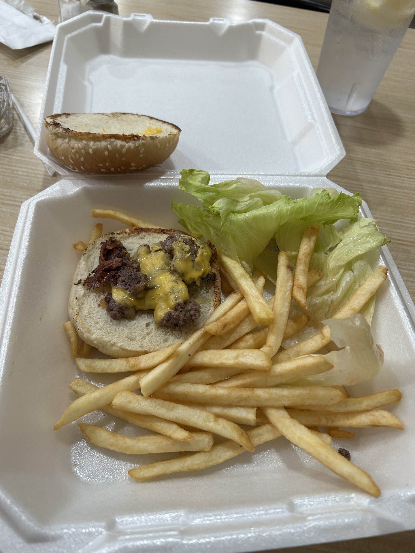 Read moreWe got our drinks ordered online with the app and then when we got our meal it was in the togo containers I think it defaults to Togo because of the app we were dinning in then what was called a Burger was not there was hardly any patty. It was the 6.99 combo 2 of them First time trying this I was disappointed never again should get the money my boyfriend paid.. the lady and boy working there didnât keep tables cleaned off. They were talking to each other a lot it was 9 at night. Had to go to rallyâs a lot better burger. I think those 2 might need training or hire someone else. If your out of a particular food say something wouldnât have mind it substituted boyfriend has fond memories of huddle house he was disappointed. Iâm aware the burger picture on the table isnât the same to be honest I felt that McDonaldâs basic cheese...