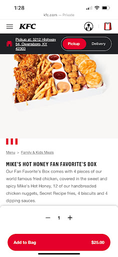 For $25, I didnât receive the advertised meal, the sides, or the sauces. Itâs frustrating to be told itâll be made right and then end up with something completely different and clearly thrown together last-minute. If this is how âfan favoritesâ are handled, KFC really needs...