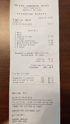 We visited the Owensboro Olive Garden last Thursday, as we have many times over the past several years. We don't eat out often, but when we do we like to redeem our Discover points for gift cards at area restaurants, and Olive Garden has historically been one of our favorites. Two notes of interest from this visit.