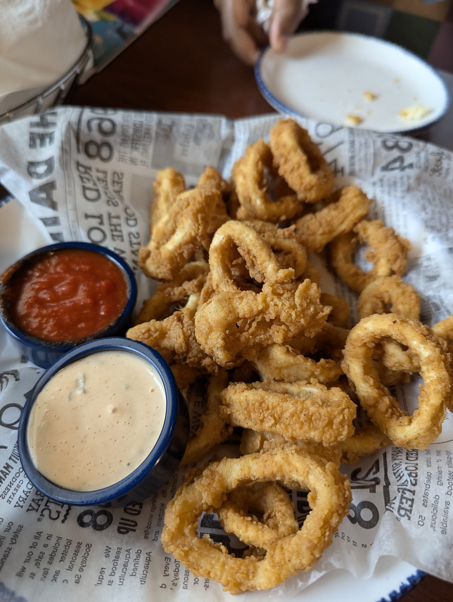 We ordered the calamari, double lobster plate and the 1lb crab dish. I literally never had lobster that was so moist and the texture wasn't chewy at all. It was somewhat flaky and delicious! There was flavor in every bite. And they brought over 2 different butter dipping sauces. I still don't know if one was for lobster and one for crab but it didn't matter. I even dipped the potato chunks in it. It was the first time I had real crab so that was an experience! I completely butchered how to open it but I was able to get it out. The waiter was nice enough to help guide us. By that time we were already a little tipsy from the tripped drink special they had (best 3 drinks I've ever had btw!)