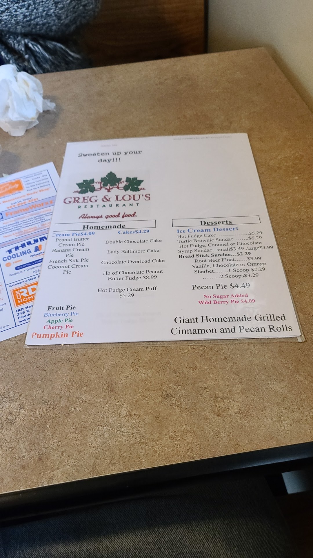 Read moreThis used to be my favorite place to go with my grandma, as a child! The food is just not the same! Hash browns soggy and crunchy at the same time! (One side got cooked) the scrambled eggs come overdone with brown on them, the sausage gravy is “premeasured”. Ergo, when it’s so watery you can barely see any, then I asked for a touch more for my last 4 bites, because it was dry, and I got charged $4.29!!! I did not ask for a whole cup! I asked for a 2oz. soufflé cup! Also, The Bill’s breakfast is hash brown with toppings and country gravy. The plate was half empty. It’s hasbtown! We always ask to substitute the gravy with chili (a 2oz. chili!!!) so instead of a substitute, they charge us $5.59 for chili! The manager would not even consider that we were never told we were being charged for chili or gravy that was visible! It was watery! Very disgusted with Greg and Lou’s. Just not conducive of a family oriented business because the customer is always right, first of all! They have NEVER taken a mistake of our bill! This is not the first time! I’m sorry but it’s just not worth the $50 I spent. I even left the server $12 because I didn’t look at the bill close enough!!!! It was $37 for two breakfasts!!!! (Before tip!) additionally… I went to the counter to dispute the charges and the manager says there’s nothing they could do! My friend was in the bathroom and, while she was in there, they threw away her Togo box! I called the manager back because my friend thought I had grabbed them, when I went to the counter, so we discovered it when we got home! Again, the manger said that “there's nothing we can do, they got thrown away”! Ok so, again, BJ’s reigns as the best...