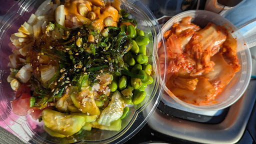 I love their salmon poke, it's so fresh and a tasty high grade. Their toppings are delicious...fresh bacon and peanuts taste amazing on anything! Its my go to spot for a healthy pig out. When I do take away, David, the owner, puts my poke bowl in one of his dine in plastic bowls so I don't have any waste or recycling hassels. I don't even use cling wrap. I put the delicious poke bowl inside of a bigger bowl on the floor of my car. I call it the Townie Bowl. Then I bring it back clean the next time I come for dinner. I'm so grateful to David for his support. I dislike the waste that can be can created from to go orders. His staff is a fun collection of kind, helpful people and all that goodness makes the food taste...