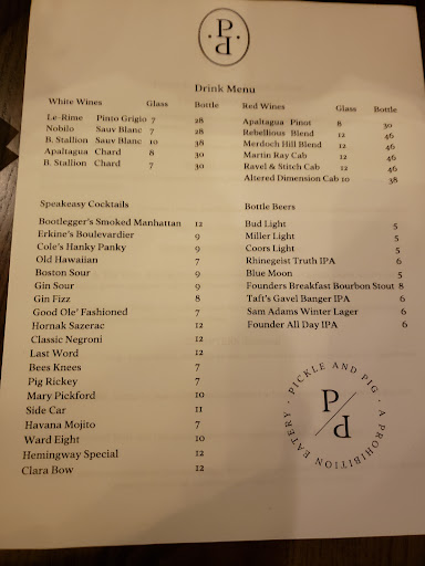 Read moreWe went here for our anniversary, because I wanted a new, fun place to celebrate. I was quite looking forward to it. First, let me say the food and drinks were very good, and the staff efficient and friendly. But, i had read an article that stated this was to be a speakeasy-type place, pickles on the tables for starters, with private room one would be taken to if mentioning "blind pig". The owner had stated that "Pickle and Pig's name originated from the homemade pickles that will be a table starter (I was under the impression these would be a free starter on each table; I may have missed it, but I don't even recall seeing them on the menu at all; I also did not notice any dessert on the menu, but did not ask) and the “blind pig” aspect of the Prohibition, which is what speakeasies were secretly known as.". No one knew anything about that. Also, the retaurant was sorely lacking in 1920s/prohibition-style decor. The dining area was simply a small room for dining off the bar area, with tables but nothing in the way of prohibition-style ambiance. Not even a white tablecloth. Truthfully, all of this is what I was looking for, but did not get. There were also to be rooms dedicated to and named after the Clue board game: study, library, and so forth. Again, nothing of the kind. While we had a good meal and well-made drinks and an enjoyable time with our adult children, we could have had that anywhere. I would go back again IF the atmosphere was truly upped a notch, and as advertised. I gave 4 stars because the experience was good enough for 3 1/2, but not poor...
