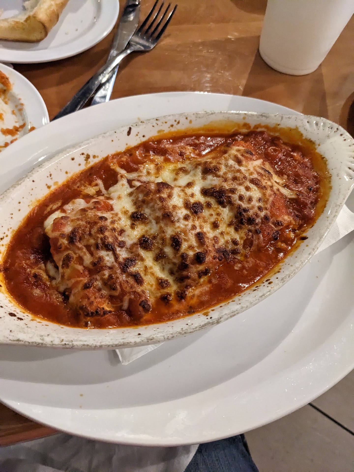Stopes in here for dinner. We ordered the calamari and garlic cheese bread. Shortly after we order they brought those items out and wow. What a huge order of calamari. It was hit and tasted pretty good. They brought out cheese sticks I guess on accident and told her we ordered garlic bread. So that came out shortly after and it was ok. We ordered our food. Chicken Alfredo and chicken piccata for my wife. While we were waiting and enjoying our appetizers. The waitress brought out a basket of rolls too. They were soft and warm. We probably could have skipped the garlic bread had we known. I ordered an old fashion while we were waiting for our food. It never came. Once I got the waitress to come back and check in us I asked if they were still fixing the old fashion. She had forgotten. So I watched her make it at the bar. Basically I got a lot of simple syrup and maybe a shot of bourbon. Super sweet. Our food came out how and it looked good. My wife was picking at hers and she told me it was super salty and we noticed too that it has a ton of capers on it. The Alfredo was ok. Little salty and very very creamy cheesy. Waitress might have been having a bad night because it was difficult to get refills or ask her for anything. Someone else ended up finally coming to the table to...
